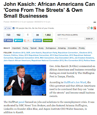 According to author Jon Ward, the Ohio governor said that African-Americans need to be convinced that they can “come off the streets” and become small business owners.