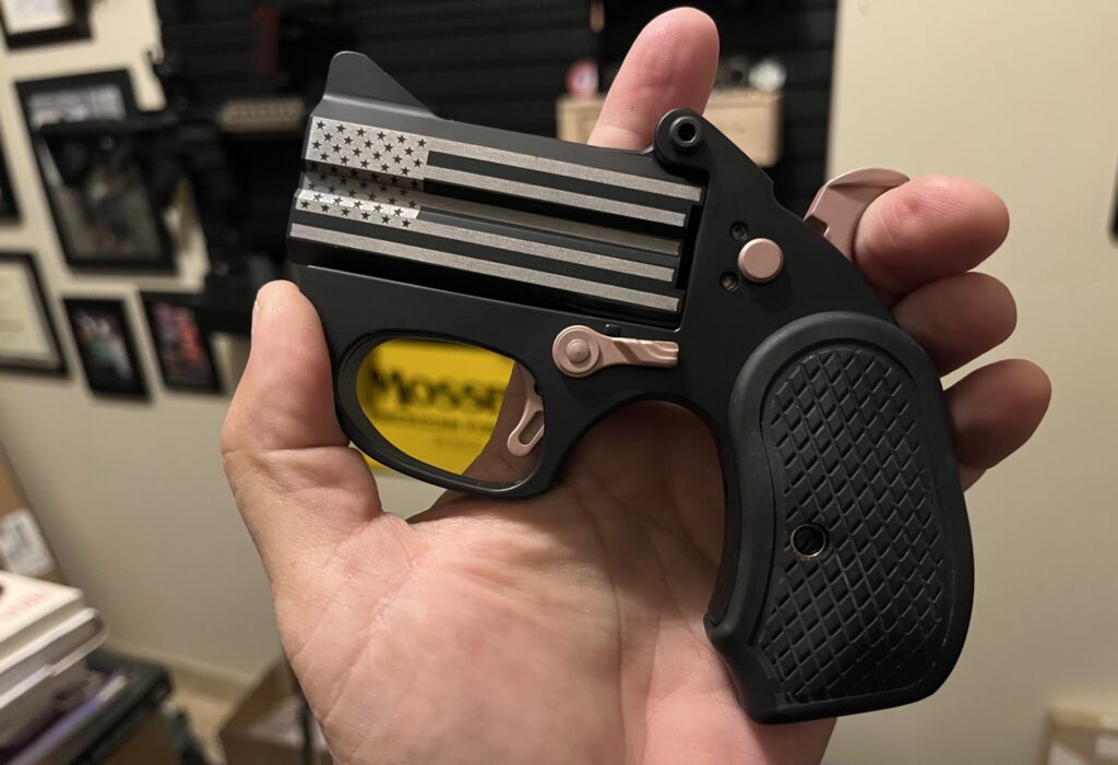 “The First Lady” is fitted with B6 grips, which provide a place for the pinkie to rest, enhancing the shooter’s grip on the firearm and, therefore, enhancing control. The B6 grips also improve comfort, which, together with the added control, make it possible to shoot the derringer with confidence.