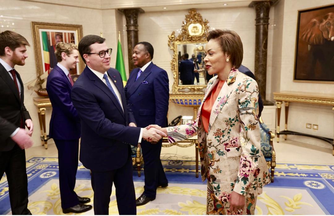 Dr. Françoise Joly shakes hands with Christian Ehrhardt, the U.S. Deputy Assistant of State for Refugees and Migration, in April 2026 on the eve of President Denis Sassou Nguesso’s April 16 inauguration. (Office of the President of the Congo)