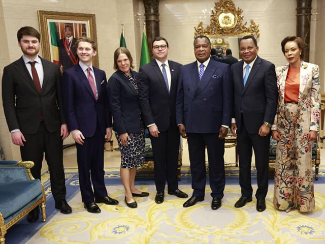 From left to right: Two members of the U.S. diplomatic delegation, U.S. Deputy Assistant Secretary of State Sarah Troutman, U.S. Deputy Assistant Secretary of State Christian Ehrhardt, Congo President Denis Nguesso, Congo Minister of Foreign Affairs Jean-Claude Gakosso, and Minister of State Dr. Françoise Joly meeting on the eve of Denis Sassou-Nguesso’s April 16, 2026, inauguration. (Office of the President of the Congo)