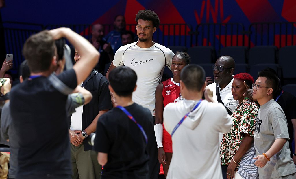 Basketball player Victor Wembanyama top poses with France’s Iman Ndiaye Rear, 4th R after the Pool 3 match between France and Belgium at the Women’s Volleyball Nations League VNL 2025 at the National Indoor Stadium in Beijing, China, June 6, 2025. (Han Yan/Xinhua via Getty Images)