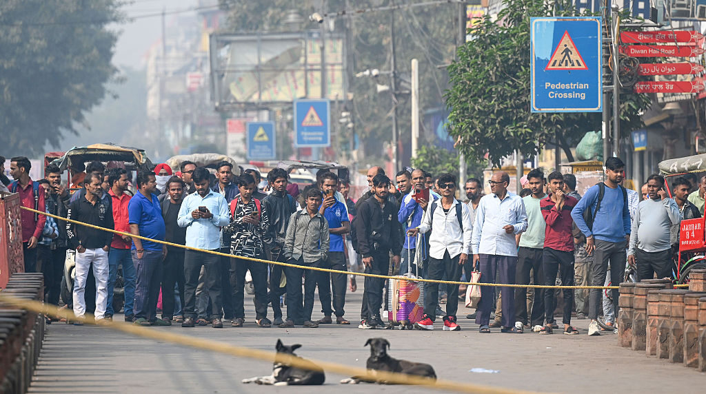 People gathered as security officials seen carrying out an investigation on the spot where an alleged blast occurred in a car yesterday outside Red Fort, on November 11, 2025 in New Delhi, India. (Sanchit Khanna/Hindustan Times via Getty Images)