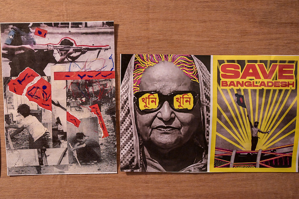 In this photograph taken on July 28, 2025, images and cartoons related to Bangladesh’s ousted prime minister Sheikh Hasina are seen pasted on a board inside her former official residence before the inauguration of the July Memorial Museum in Dhaka. (MUNIR UZ ZAMAN/AFP via Getty)