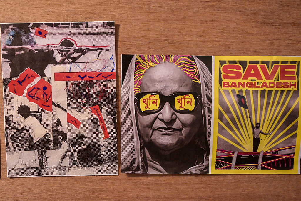 In this photograph taken on July 28, 2025, images and cartoons related to Bangladesh’s ousted prime minister Sheikh Hasina are seen pasted on a board inside her former official residence before the inauguration of the July Memorial Museum in Dhaka. (MUNIR UZ ZAMAN/AFP via Getty)
