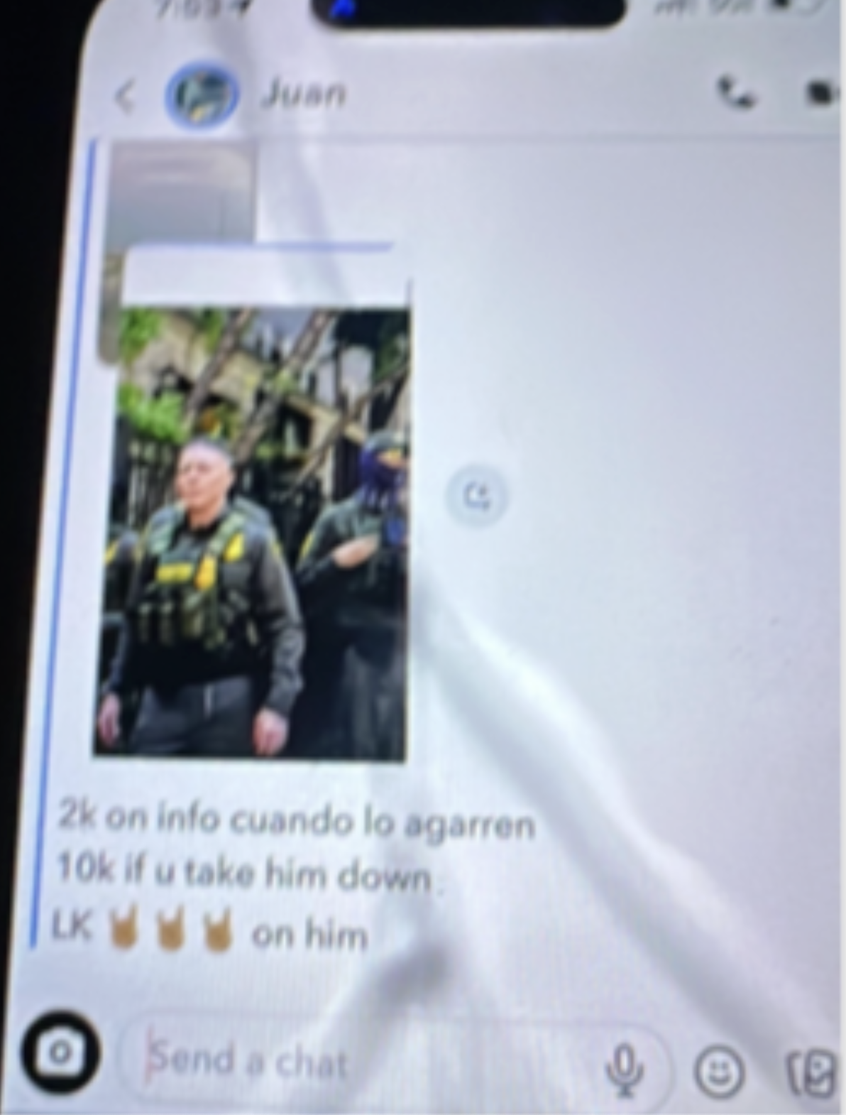HSI Chicago received a screenshot of a Snapchat conversation from a user named “Juan” appearing to place a $2,000 bounty for information “cuando lo agarren,” which translates to “when they catch him,” and a $10,000 reward “if you take him down.” A third response of “LK….on him” indicates the involvement of the Latin Kings. [Emphasis added]