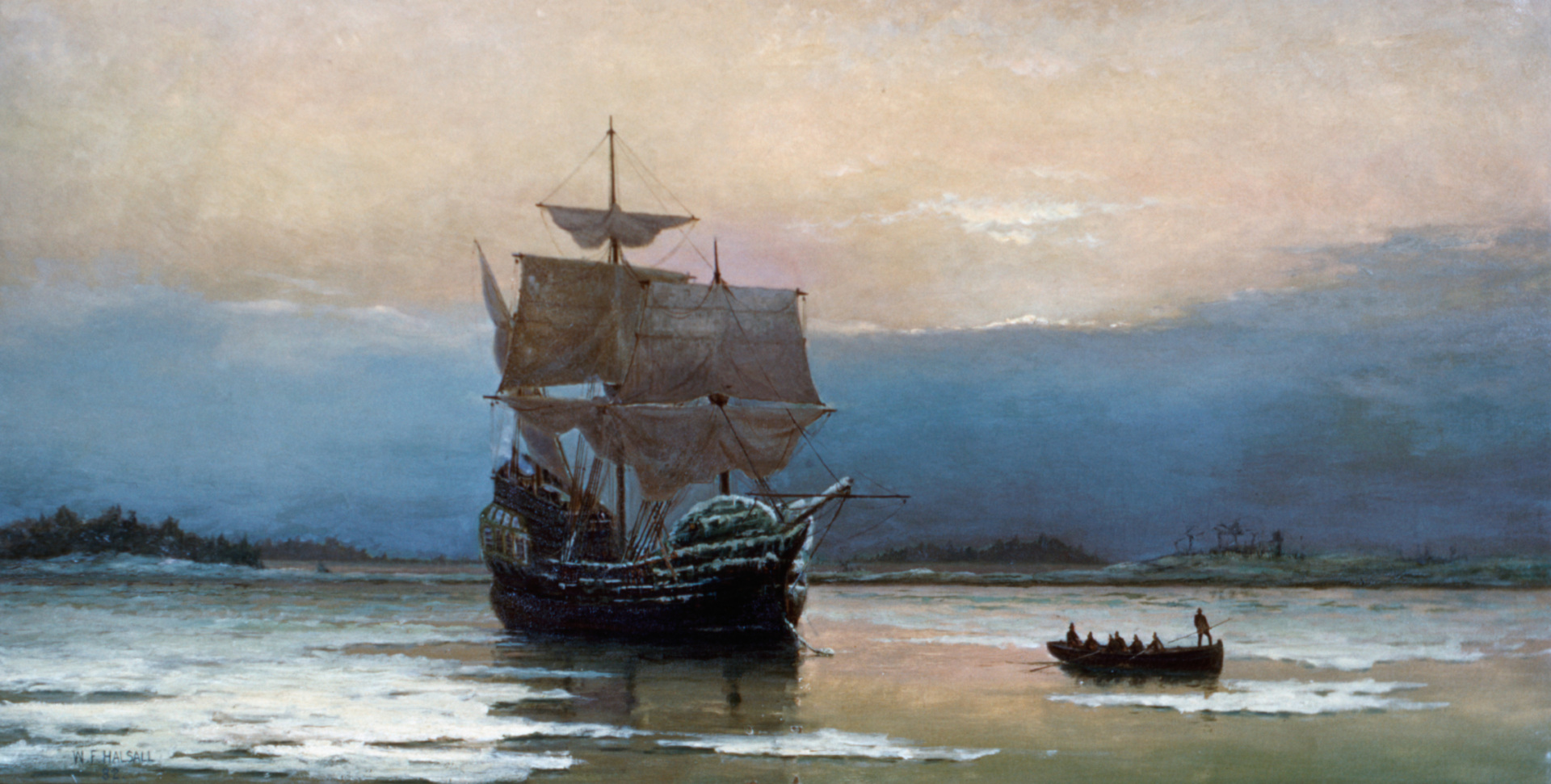 The Mayflower in Plymouth Harbor, Massachusetts, 1620. Painting by William Halsall, 1882. (Photo by Barney Burstein/Corbis/VCG via Getty Images)