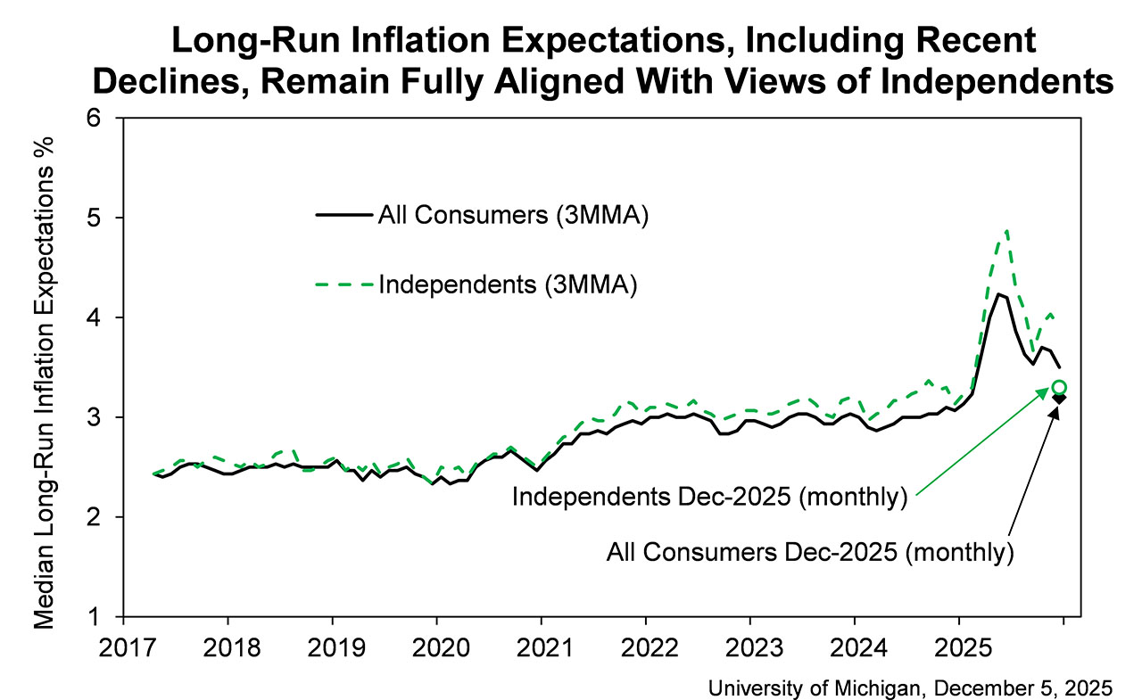The University of Michigan’s December survey shows consumer inflation expectations falling for the fourth straight month. Year-ahead expectations dropped to 4.1 percent, the lowest reading since January 2025. Five-year expectations eased to 3.2 percent, matching the January level.