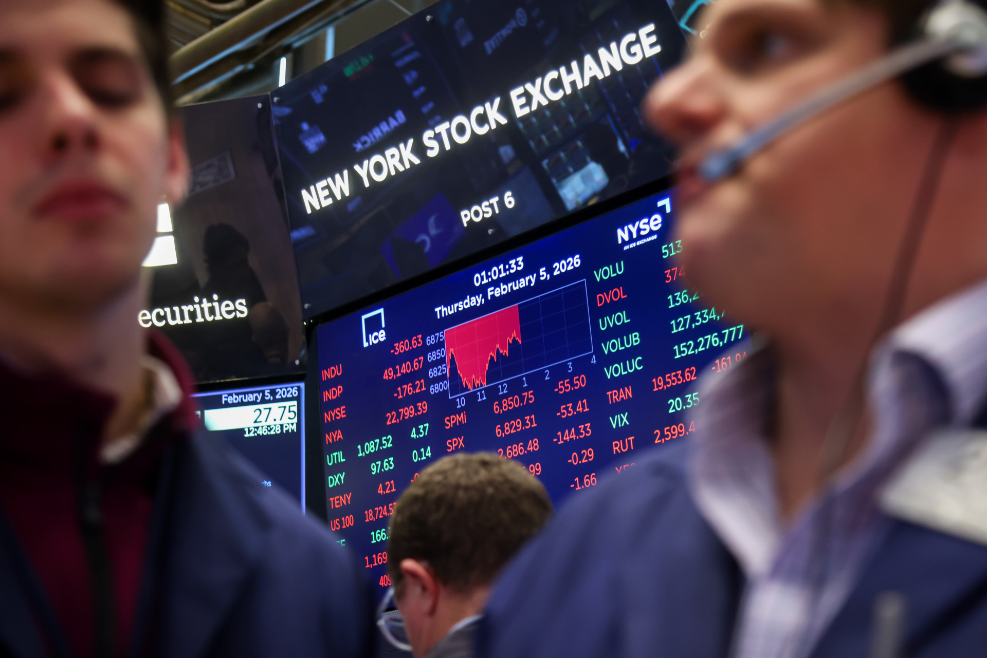 Traders work on the floor of the New York Stock Exchange (NYSE) on Feb. 5, 2026. Another burst of heavy selling pummeled software stocks and crypto, with weak jobs data exacerbating an equity rout spurred by concern over the impact of artificial intelligence on valuations. (Photo: Michael Nagle/Bloomberg via Getty Images)