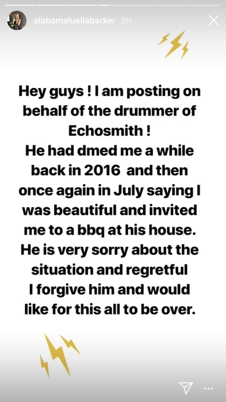 In a message posted to her social media, Alabama Luella Barker said she had heard from Mr. Sierota and has accepted his apology for his repeated messages to her: