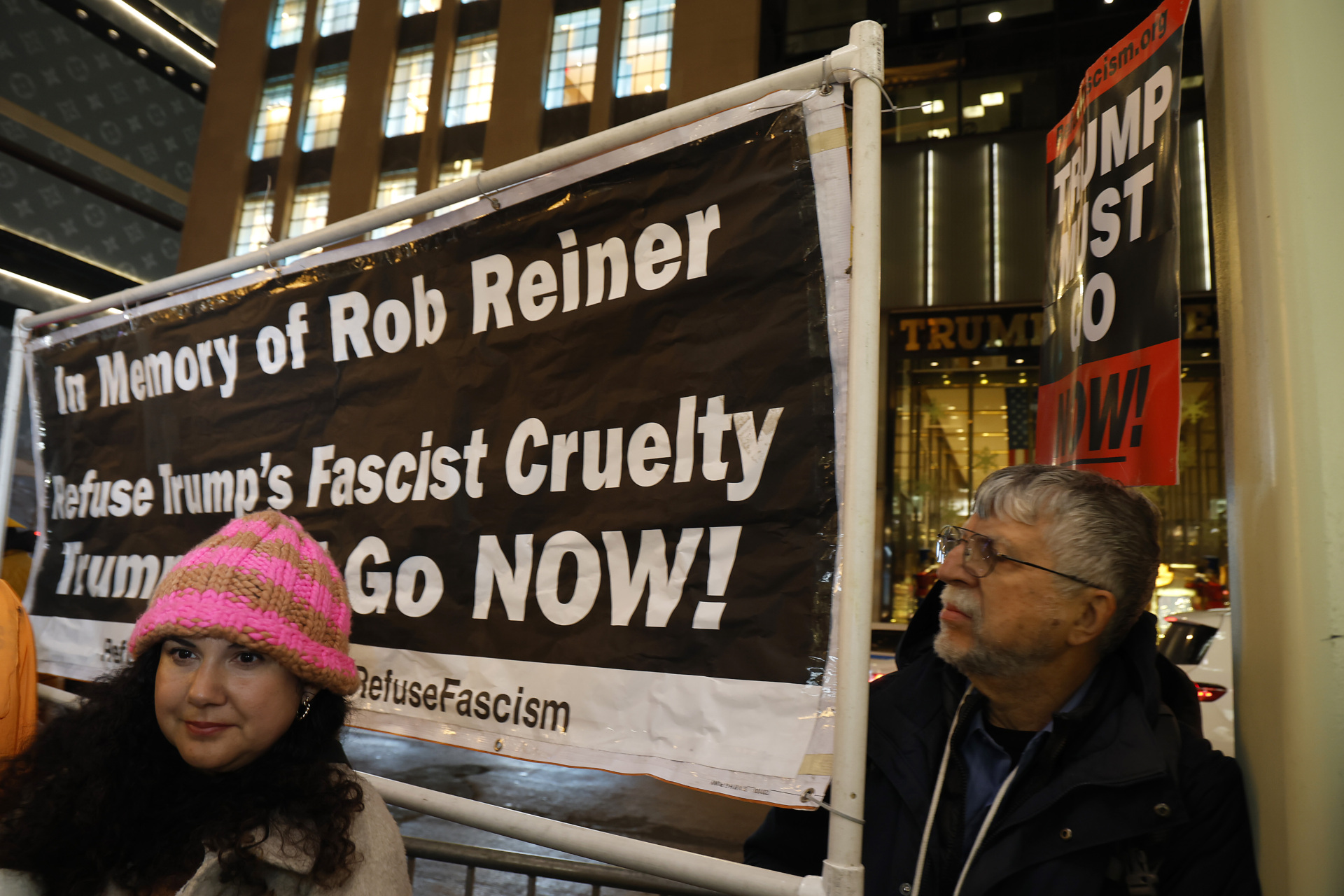 Activists demonstrate during a vigil in memory of Rob Reiner outside Trump Tower on December 18, 2025, in New York City. Actor and director Rob Reiner and his wife, Michele Singer Reiner, were allegedly killed by their son, Nick Reiner, on December 14, 2025, at their home in Brentwood. He has been charged with two counts of first-degree murder, according to the Los Angeles County District Attorney. (John Lamparski/Getty Images)