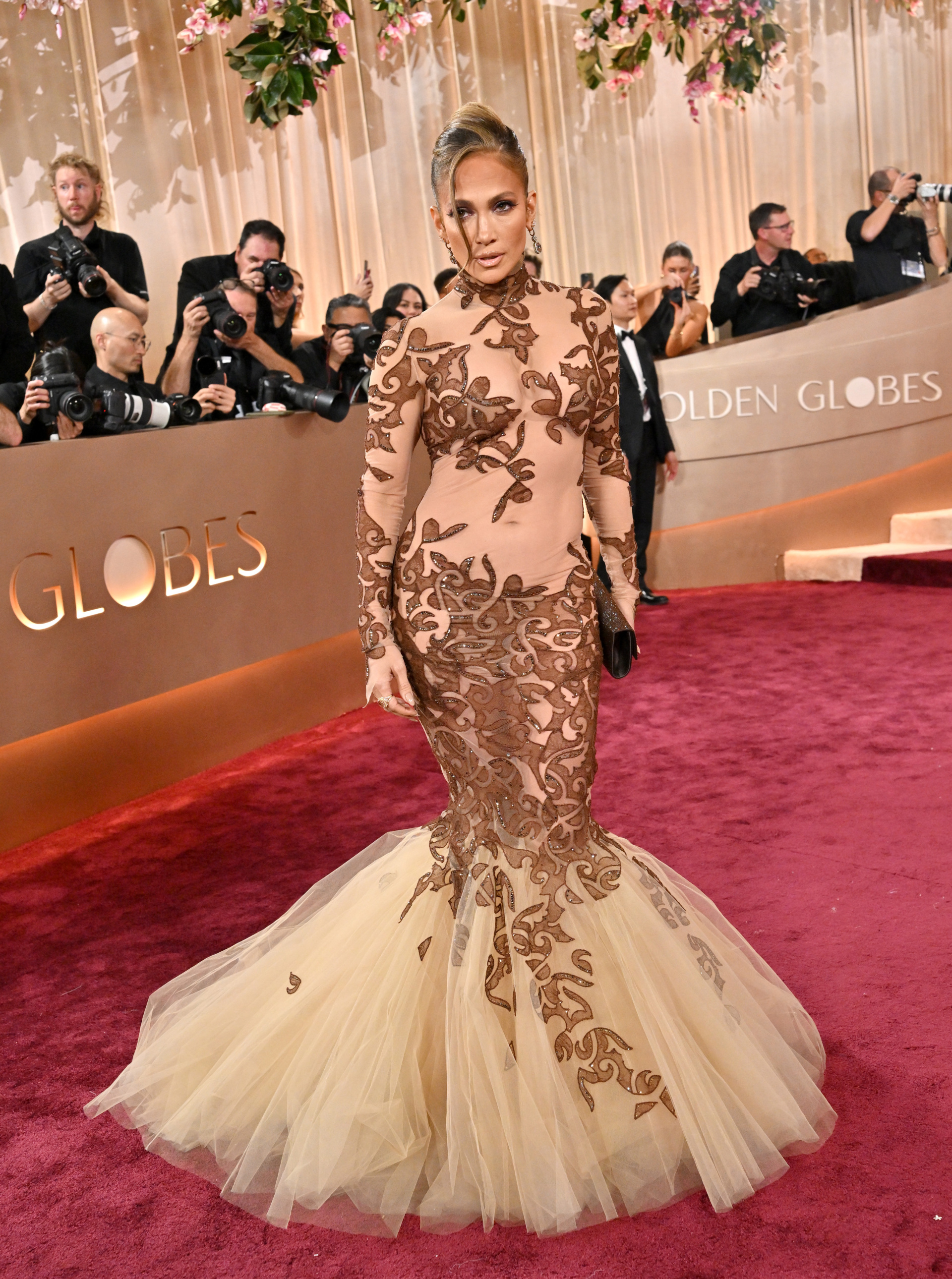 In true Burton style, even Lawrence’s clutch paired with the floral embroidery of the gown.
