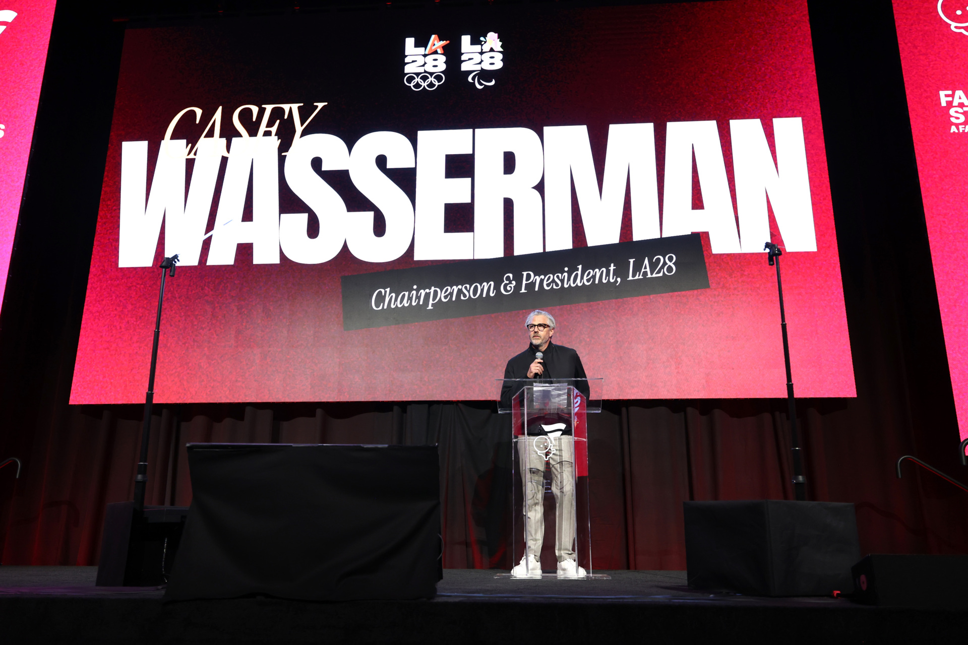 Casey Wasserman, Chairperson and President, LA28 speaks onstage during the launch of Fanatics Studios, a new, transformative global sports and entertainment studio, during an event at Intuit Dome on January 13, 2026 in Inglewood, California. (Monica Schipper/Getty Images for Fanatics)