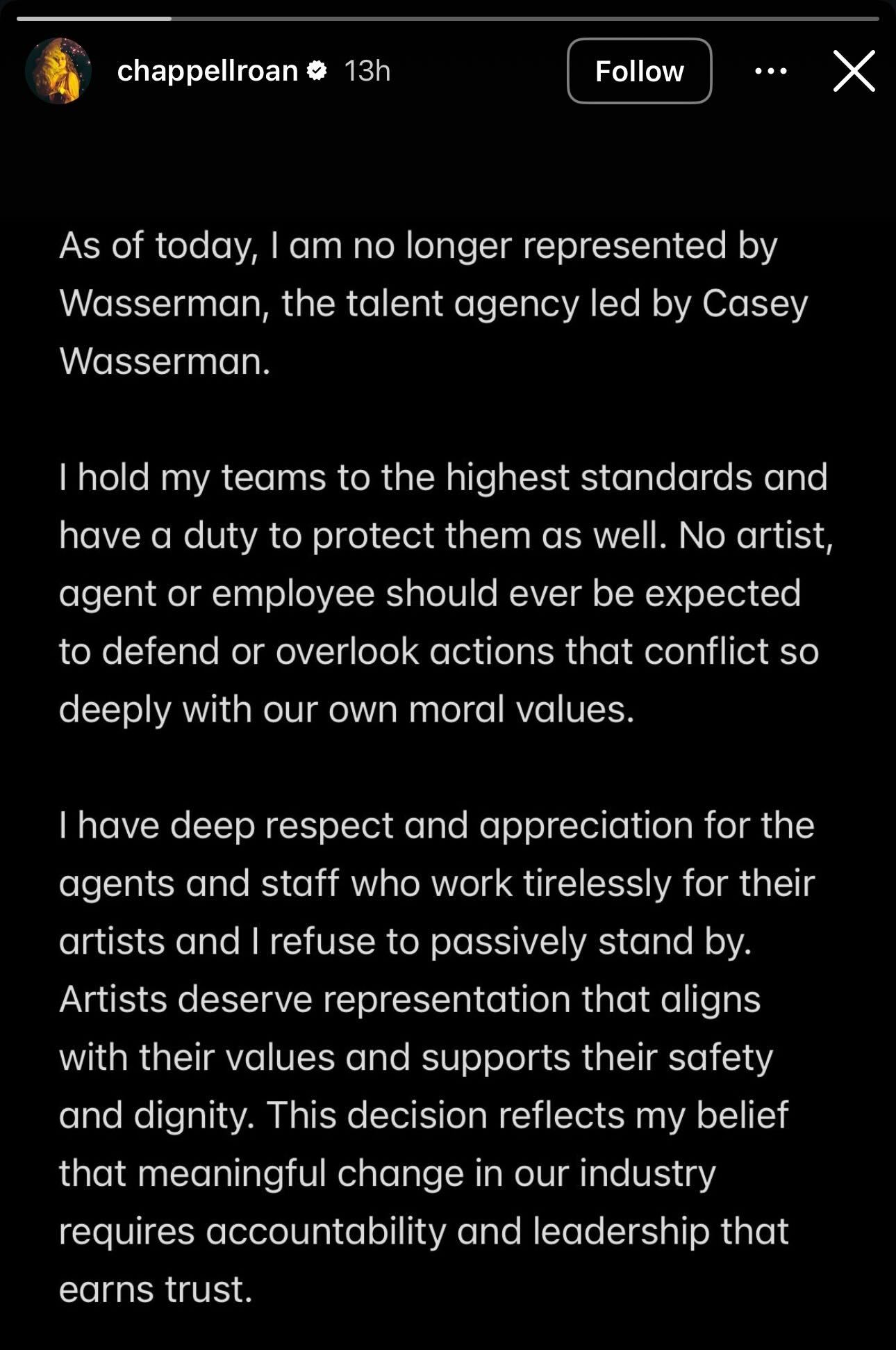 “I hold my teams to the highest standards and have a duty to protect them as well. No artist, agent or employee should ever be expected to defend or overlook actions that conflict so deeply with our own moral values,” Roan continued in her statement.