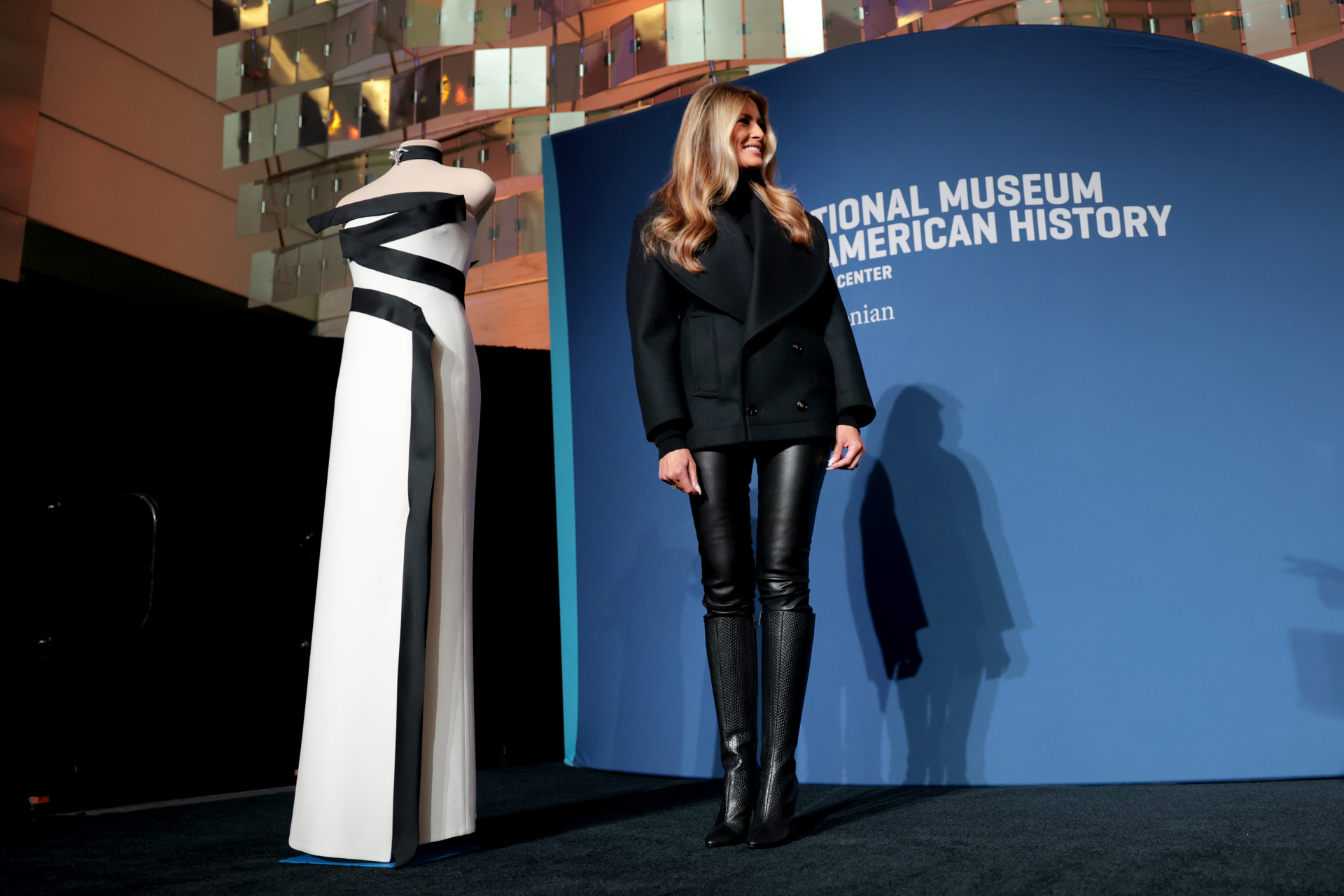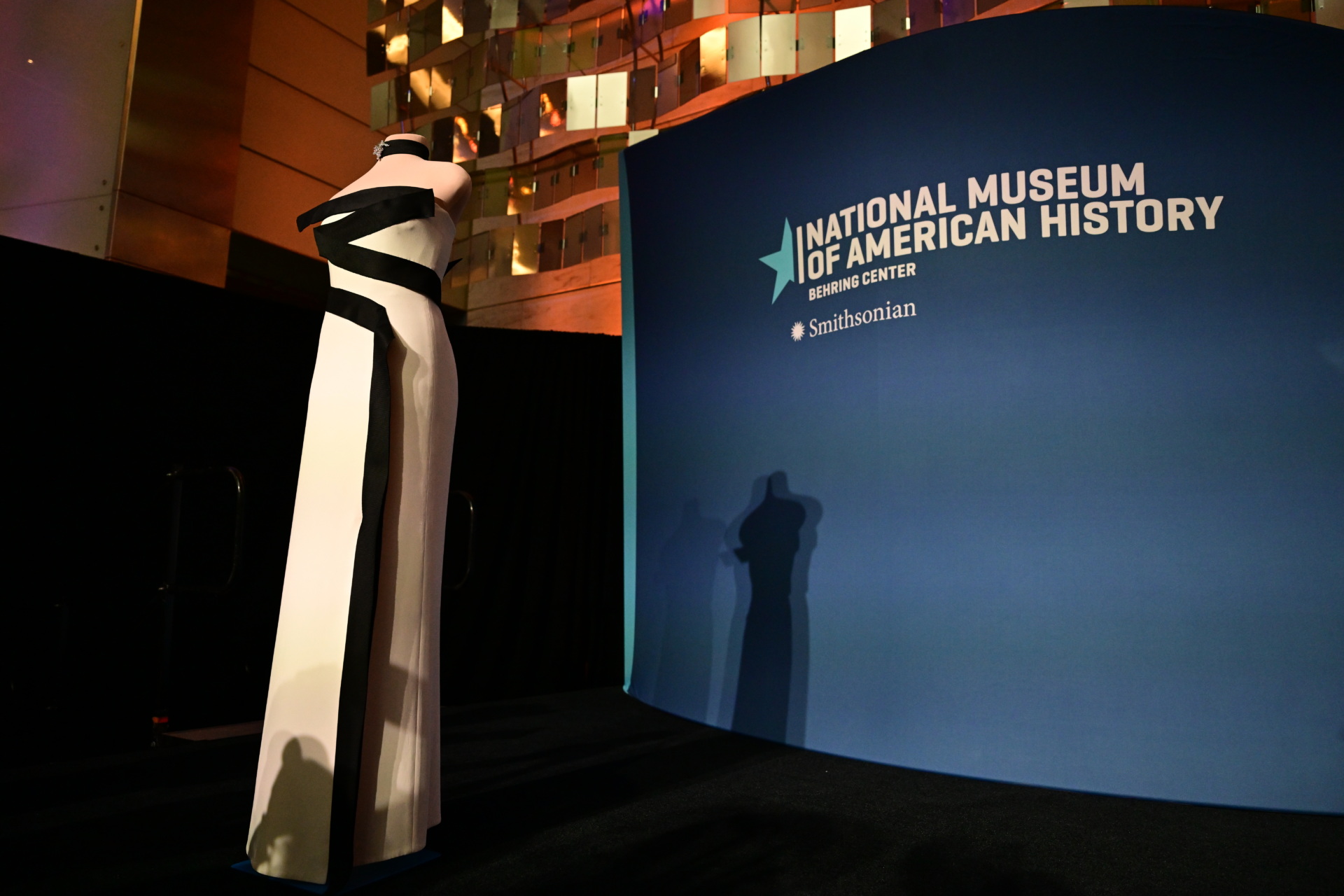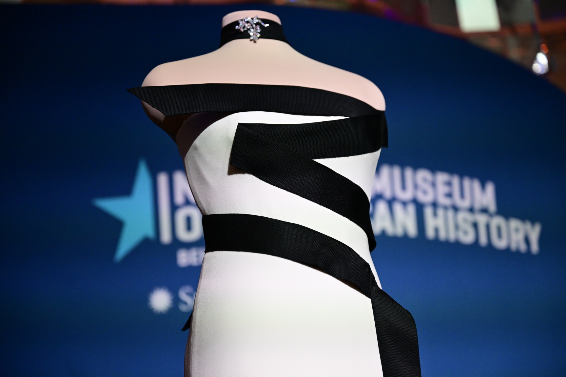 WASHINGTON, UNITED STATES – FEBRUARY 20: A view of strapless black-and-white gown, designed by first Lady of the US Melania Trumpâs fashion designer and stylist Herve Pierre, at the Smithsonian National Museum of American History in Washington, D.C., US on February 20, 2026. The strapless black-and-white gown was designed by her longtime fashion designer and stylist, Herve Pierre, who is seen sketching it for the first lady and fitting her in it in ‘Melania,’ her recently released documentary. (Photo by Kyle Mazza/Anadolu via Getty Images)