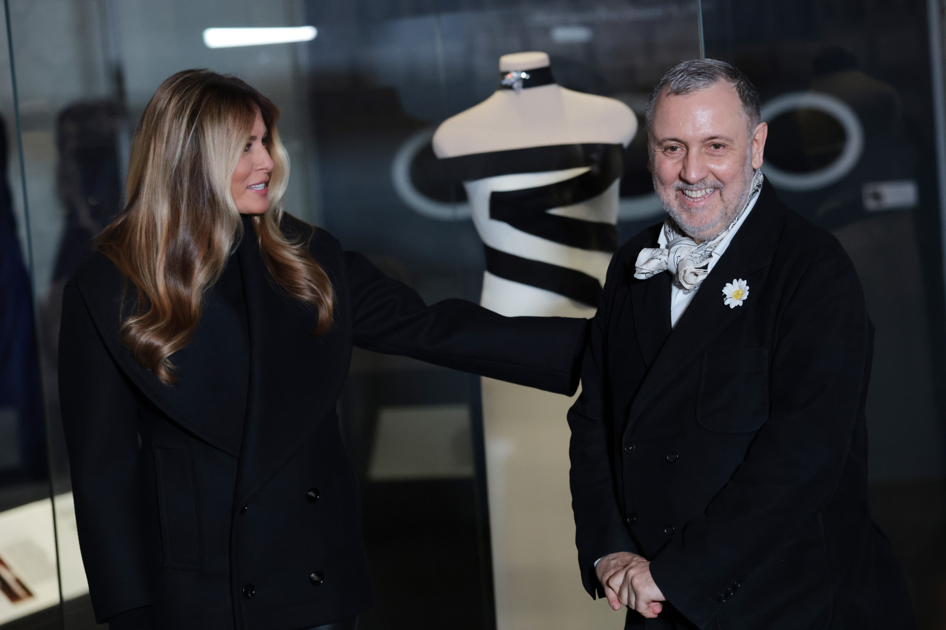 WASHINGTON, DC – FEBRUARY 20: First Lady Melania Trump poses with fashion designer Herve Pierre at an event at the Smithsonian National Museum of American History where the first lady donated her second inaugural gown to the museum on February 20, 2026 in Washington, DC. Mrs. Trump donated her second inaugural dress which was designed by Pierre, who also designed her first inauguration dress. (Photo by Anna Moneymaker/Getty Images)