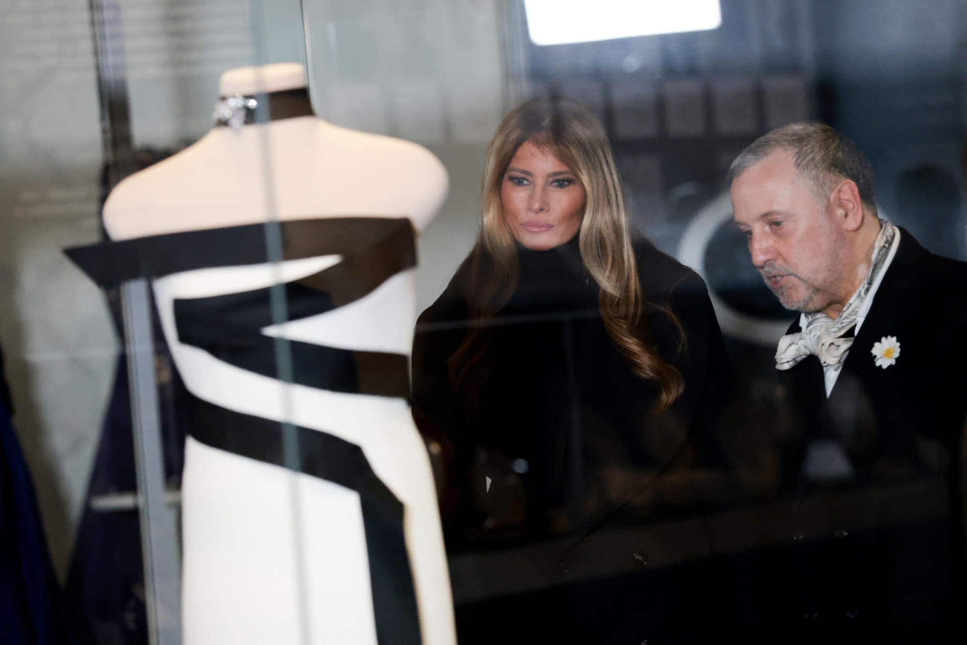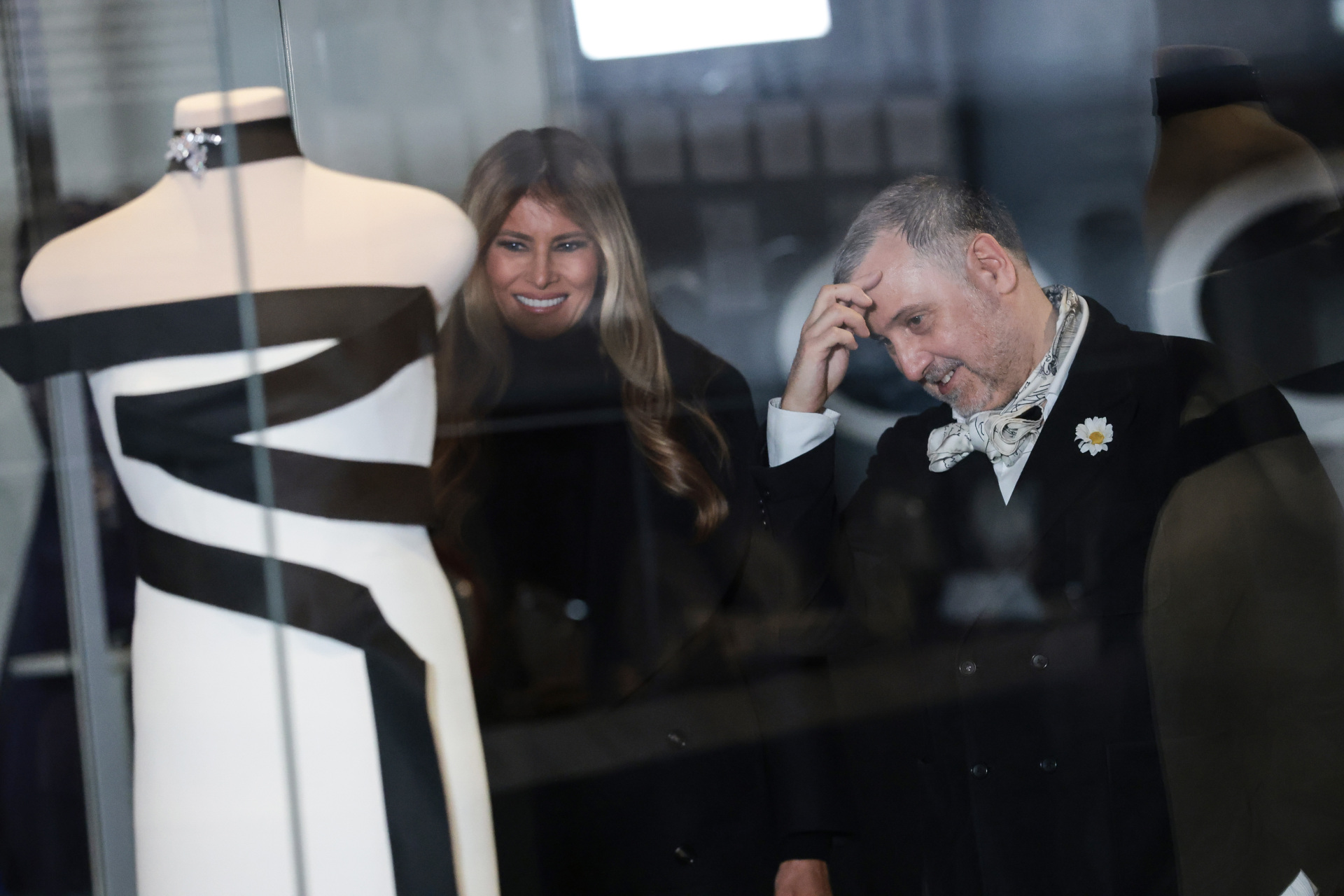 WASHINGTON, DC – FEBRUARY 20: First Lady Melania Trump and fashion designer Herve Pierre view her second inaugural dress during an event at the Smithsonian National Museum of American History where the first lady donated her gown to the museum on February 20, 2026 in Washington, DC. Mrs. Trump donated her second inaugural dress which was designed by Pierre, who also designed her first inauguration dress. (Photo by Anna Moneymaker/Getty Images)