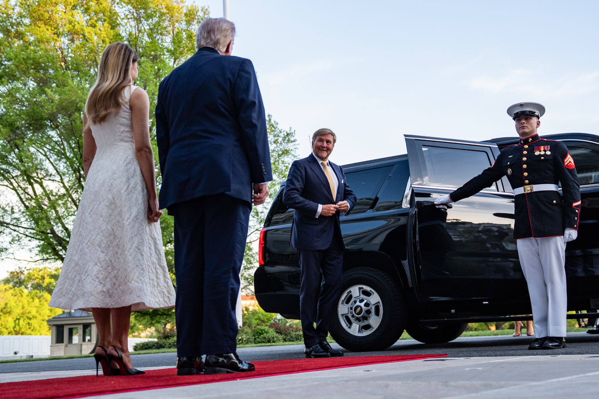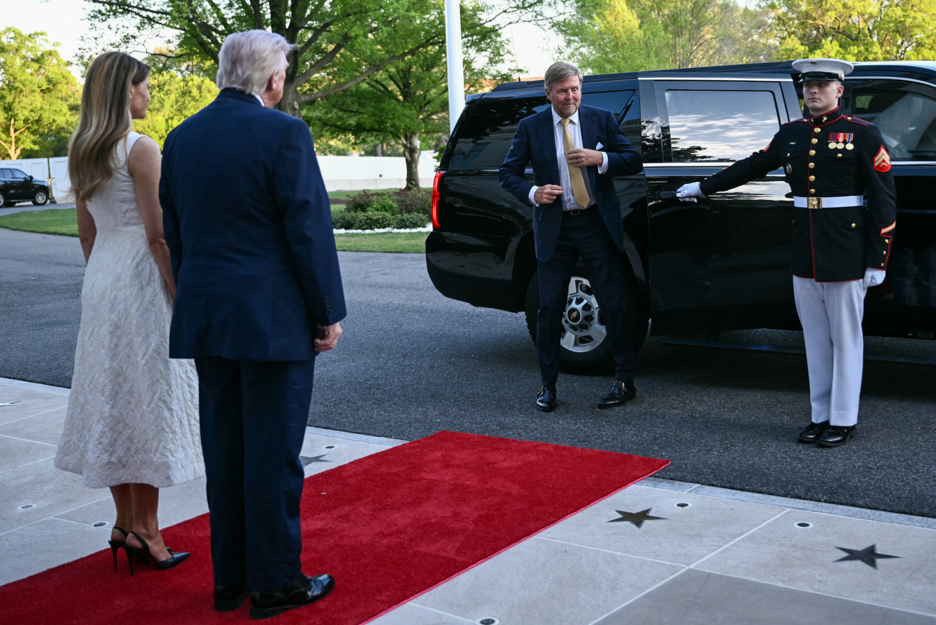 King of the Netherlands Willem-Alexander (C-R) arrives with Queen Maxima (not pictured) as they are welcomed by US President Donald Trump and First Lady Melania Trump into the White House in Washington, DC, on April 13, 2026. (Brendan Smialowski / AFP via Getty Images)