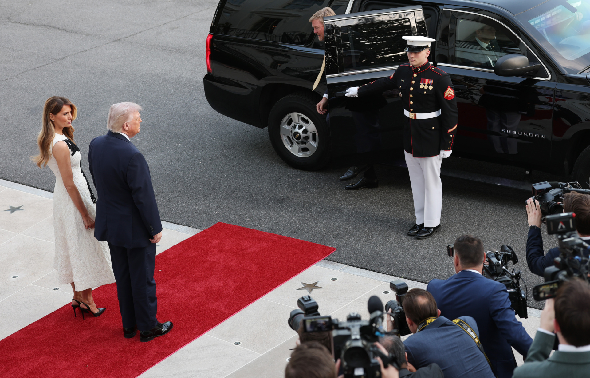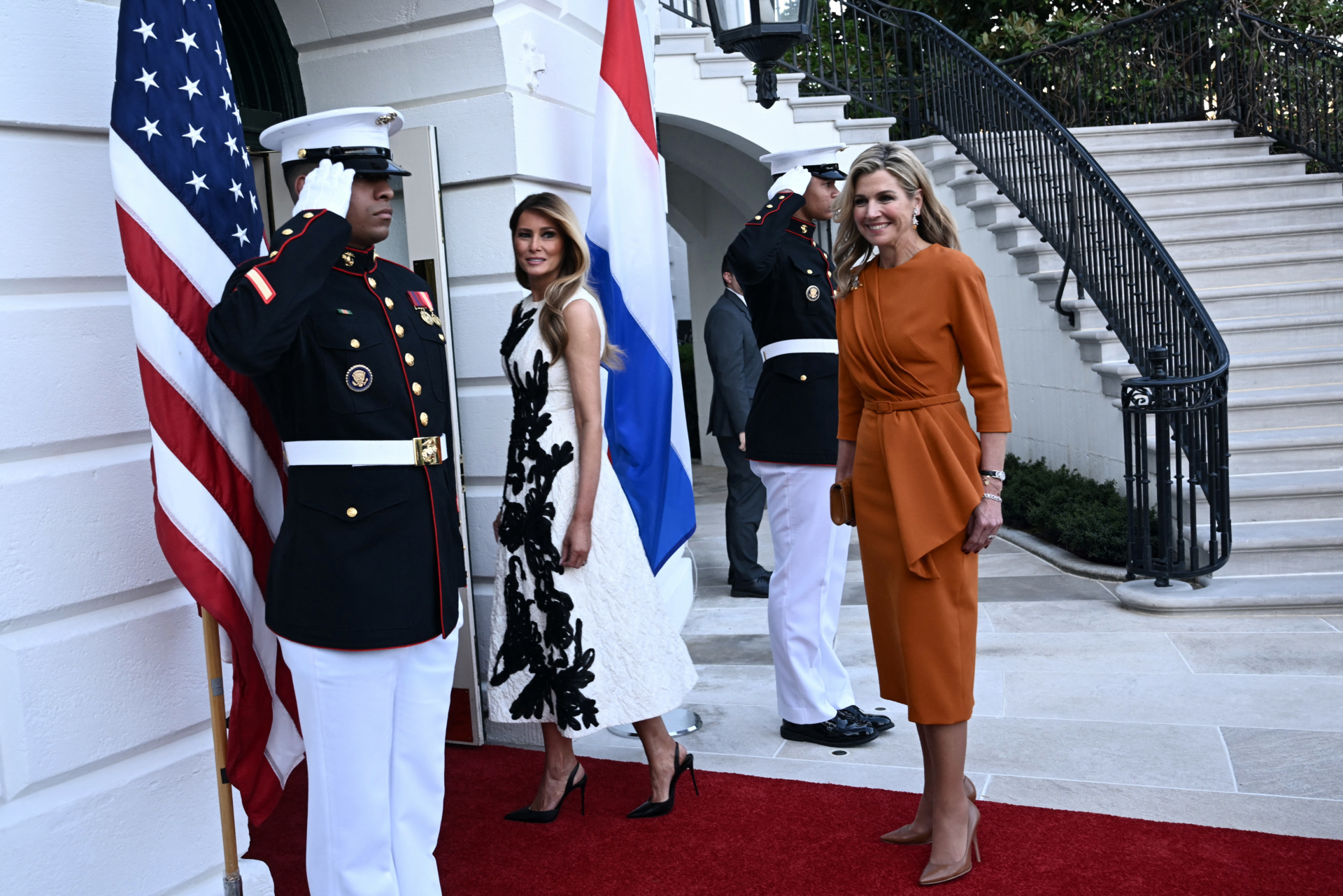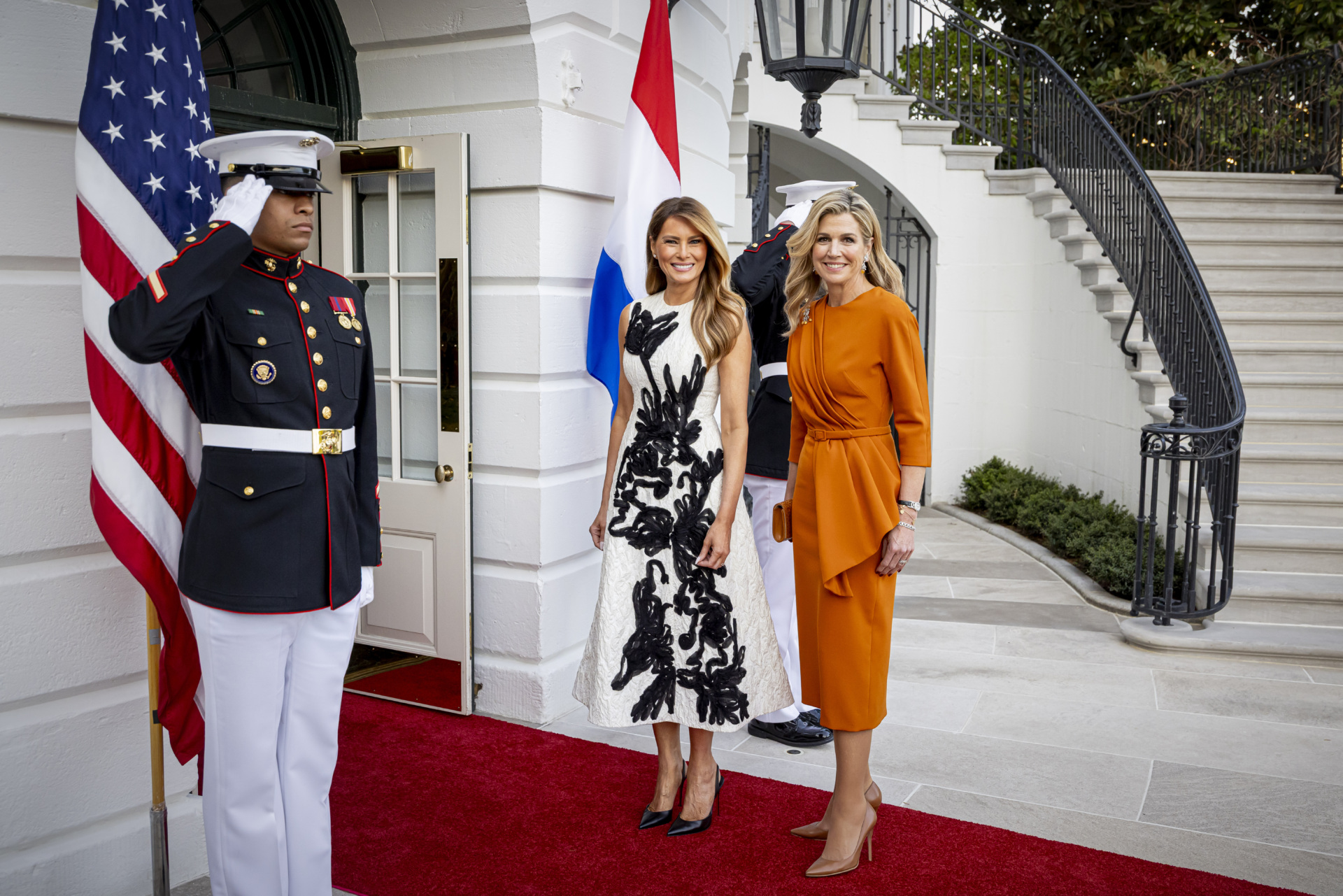 First Lady Melania Trump, alongside her husband, welcomed King Willem-Alexander and Queen Maxima of the Netherlands to the White House on Monday wearing a bold black and white cocktail dress.