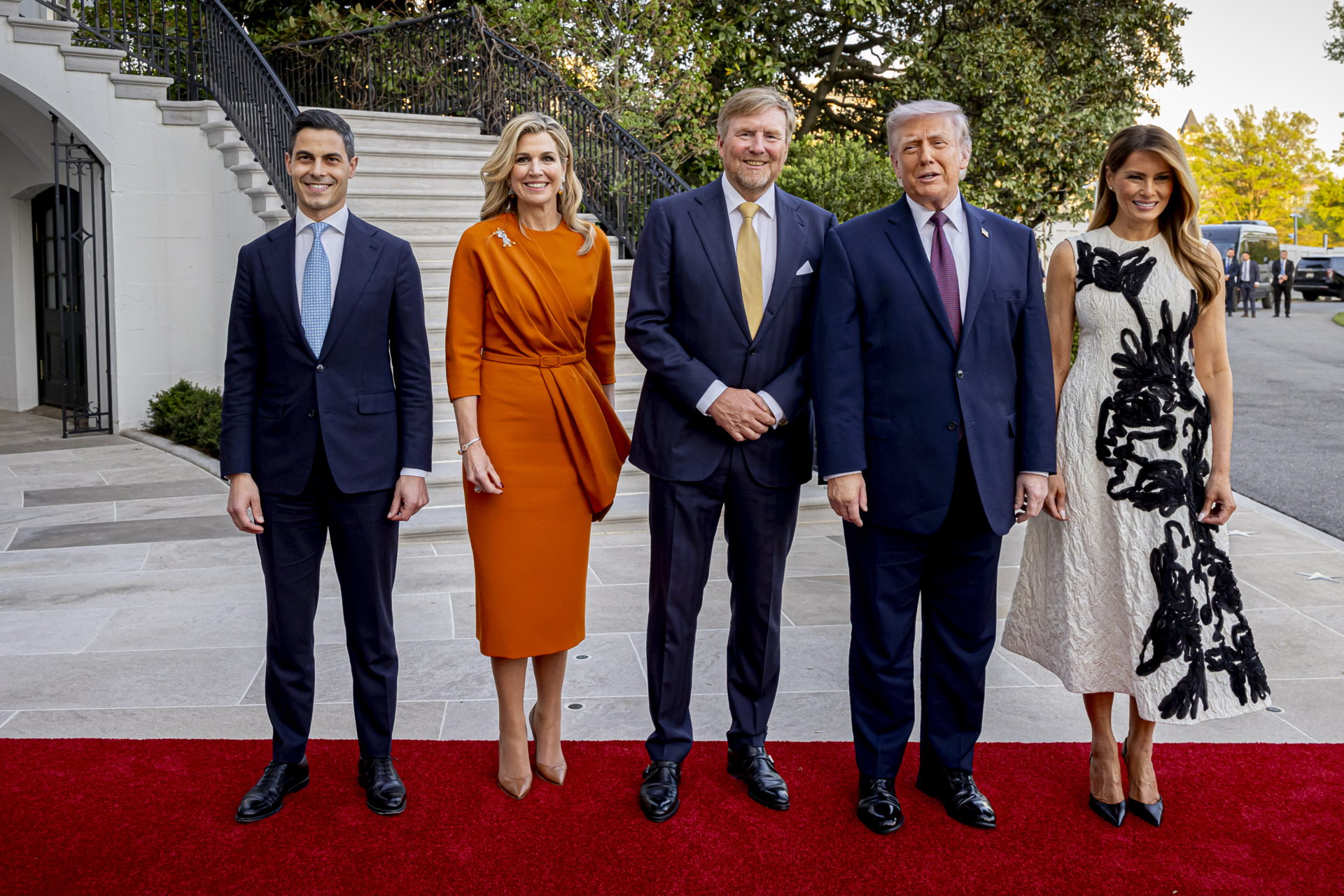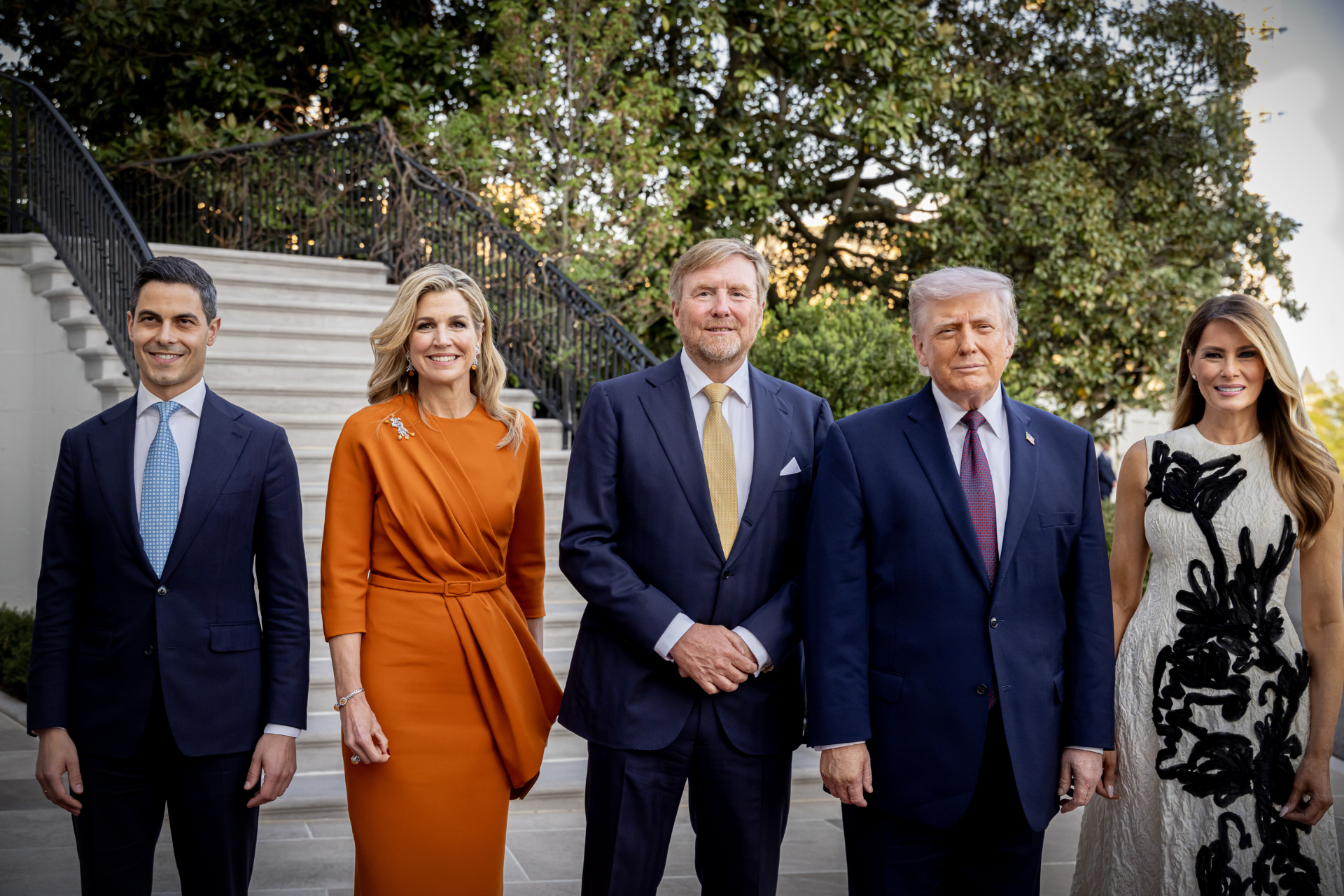 (L-R) Prime Minister Rob Jetten of The Netherlands, Queen Maxima of the Netherlands, King Willem-Alexander of The Netherlands, President Donald Trump of The United States and First Lady Melania Trump at the White House. (Patrick van Katwijk/Getty)
