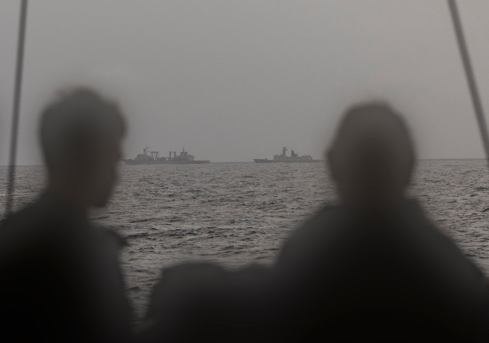 Royal Australian Navy sailors on HMAS Arunta keeping watch on People’s Liberation Army-Navy (PLA-N) Fuchi-class replenishment vessel Weishanhu and Jiangkai-class frigate Hengyang in the Tasman Sea. / Australia Defence Forces Image