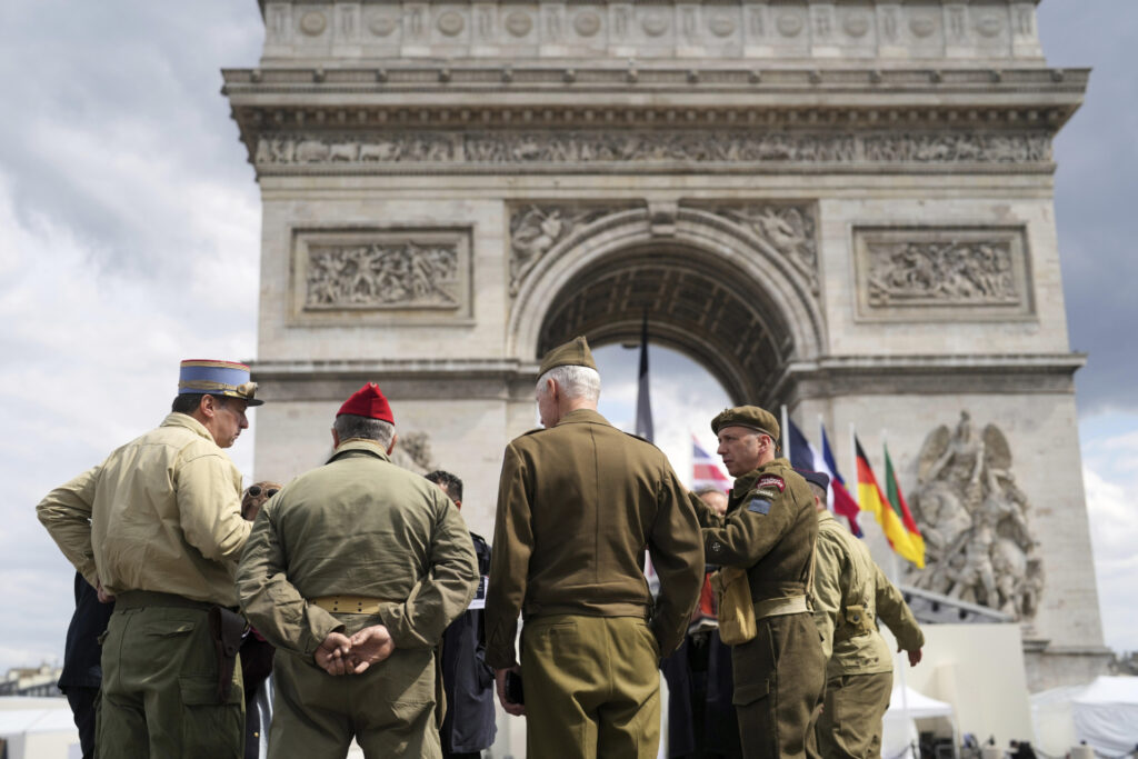 Reenactors gather at the Arc de Triomphe before ceremonies marking the 80th anniversary of the end of World War II in Europe, Thursday, May 8, 2025 in Paris. (AP Photo/Thibault Camus)