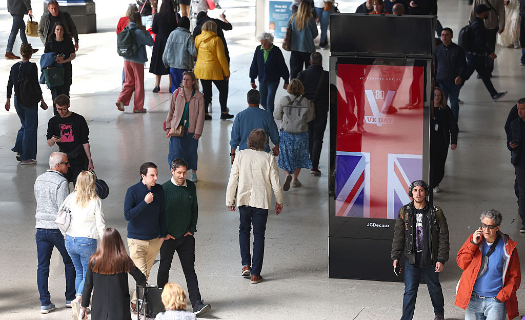 Rail users are seen next to a VE Day commemoration poster following a two minutes silence in Waterloo station on May 8, 2025 in London. (Peter Nicholls/Getty Images)