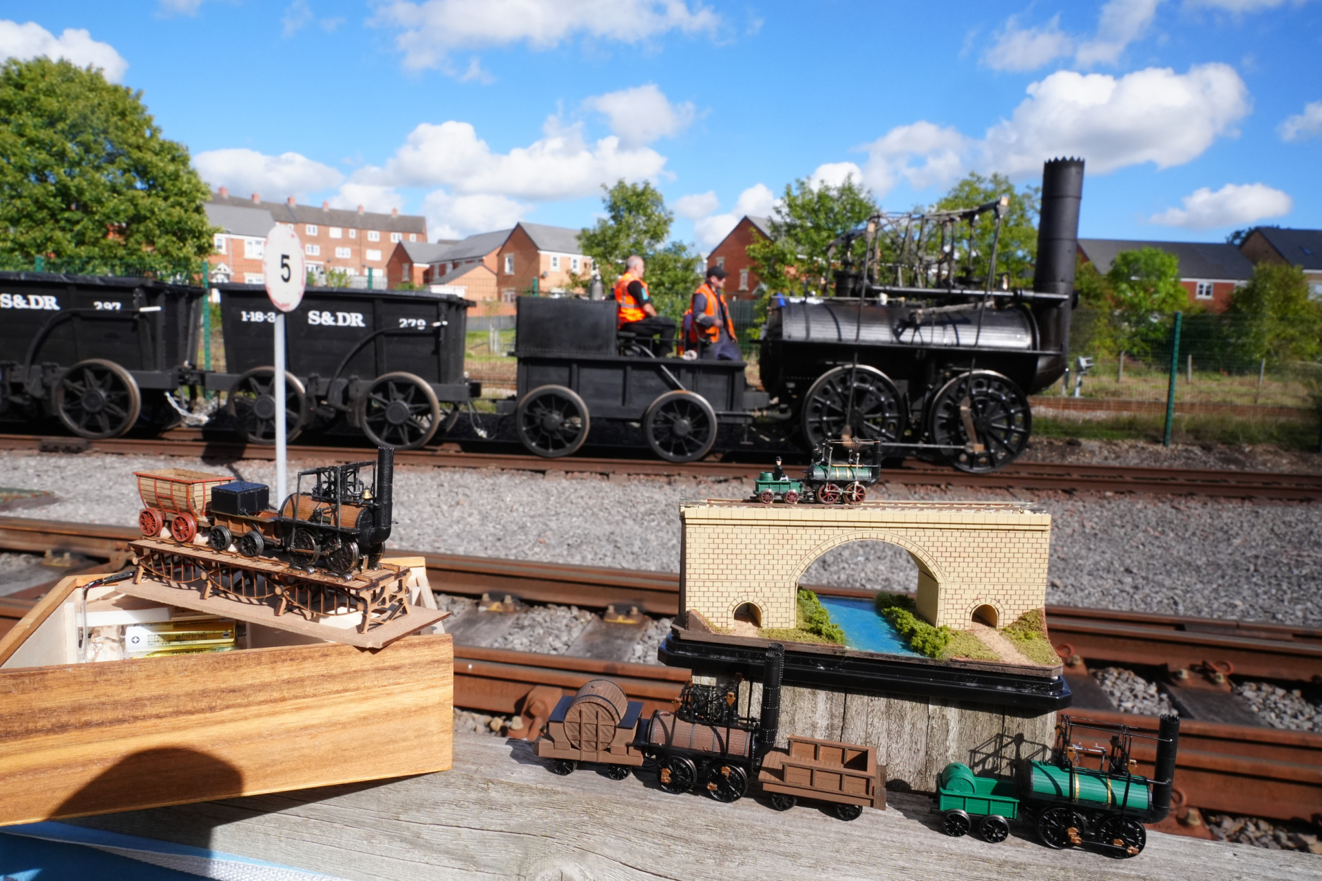 Locomotion No 1, which in 1825 was the first steam locomotive to pull a passenger-carrying train, passes a replica model of itself during a test run for ‘The Railway 200 Special’ at the Locomotion Museum in Shildon, County Durham, ahead of the 200th anniversary of the passenger railways on Saturday September 27. (Photo by Owen Humphreys/PA Images via Getty Images)