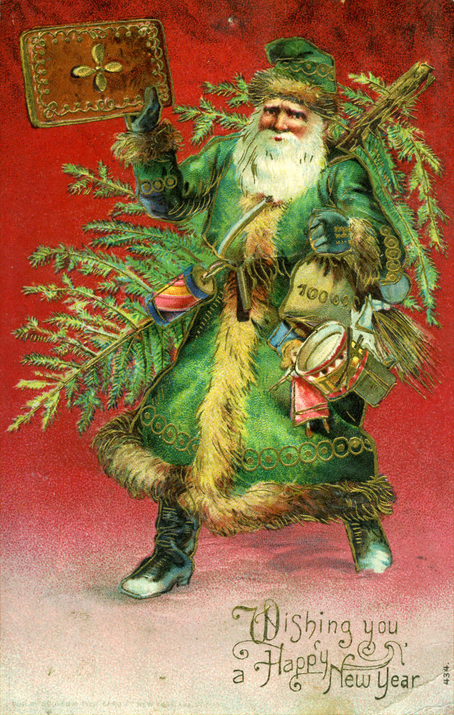 File/A Christmas postcard printed in Germany around 1910 sees Father Christmas wearing a green suit. He first appeared in yuletide folklore back in the 15th century.(Transcendental Graphics/Getty)