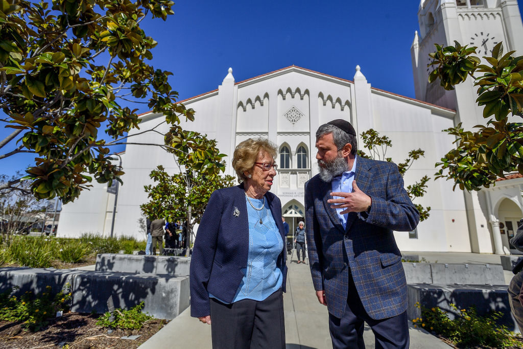 Holocaust survivor Eva Schloss, left, chats with Chabad Rabbi Reuven Mintz at Newport Harbor High School after Schloss meet with students involved in a party with Nazi salutes around a makeshift swastika in Newport Beach, CA, on Thursday, Mar 7, 2019. (Jeff Gritchen/MediaNews Group/Orange County Register via Getty Images)