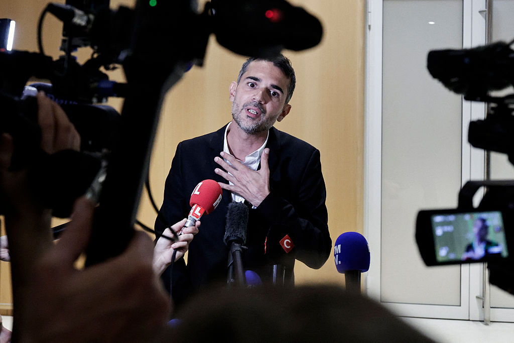 French author Aurélien Poirson-Atlan, AKA Zoe Sagan, speaks during a break in his trial with nine other persons accused of sexist cyber-harassment of the wife of the French President, in Paris, on October 28, 2025. Ten people have now been found guilty of sexist cyber-harassment of Brigitte Macron, in the latest case sparked by unsubstantiated gender claims thrown at her for years in France and beyond. (STEPHANE DE SAKUTIN/AFP via Getty)