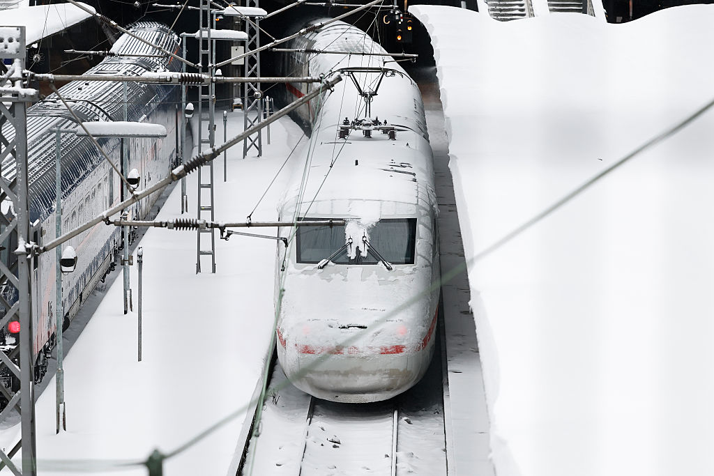HAMBURG, GERMANY – JANUARY 9: An ICE train covered with snow is seen at the main station during a winter snow storm on January 9, 2026 in Hamburg, Germany. Storm “Elli” is blanketing northern Germany with snow, leading to school closures and travel complications. (Photo by Morris MacMatzen/Getty Images)