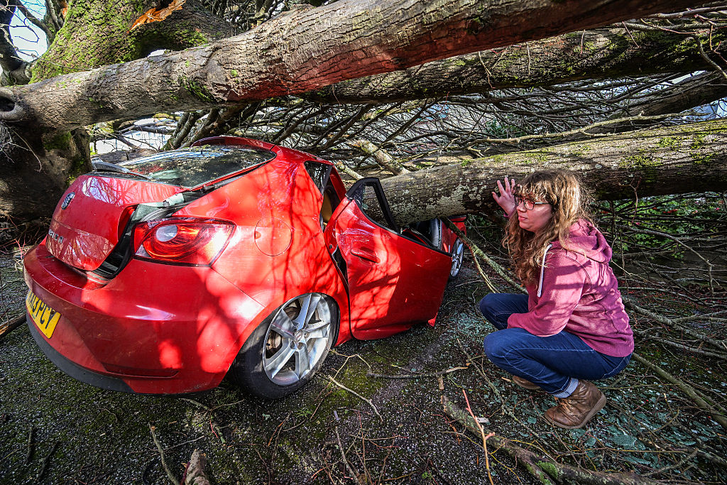 FALMOUTH, ENGLAND – JANUARY 09: Falmouth University student Anna Richmond inspects the damage to her car which was crushed outside her rented accommodation by fallen trees during Storm Goretti on January 09, 2026 in Falmouth, England. Storm Goretti, named by Météo-France, is the first named storm of 2026 to hit the UK. Red “danger to life” warnings have been issued in the South West and amber warnings for snow and strong winds have been issued for the Midlands and the Isles of Scilly. Rain is an additional hazard in parts of Wales and eastern England. (Photo by Hugh Hastings/Getty Images)