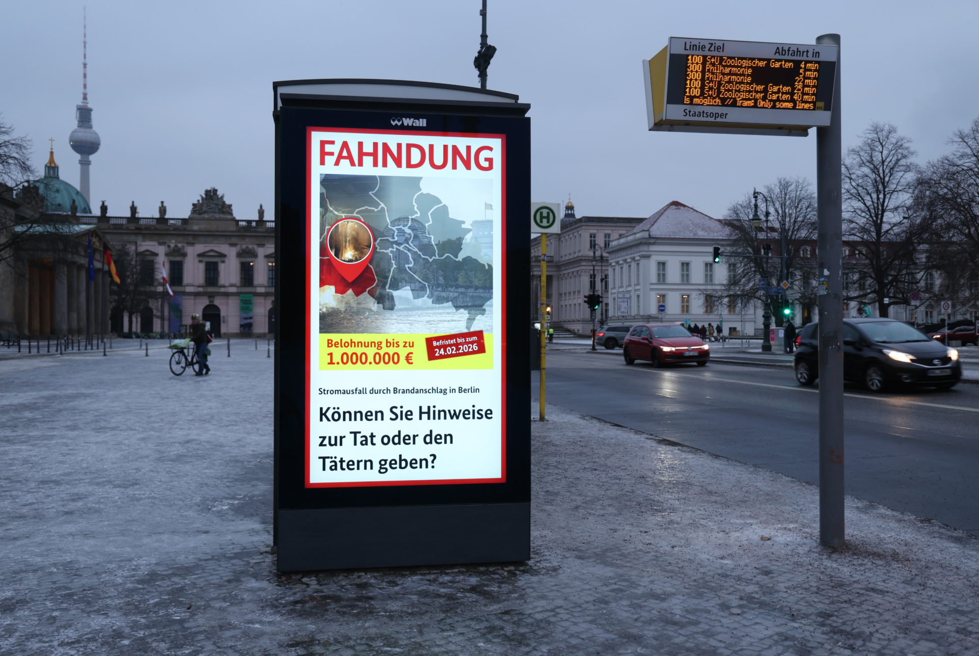 BERLIN, GERMANY – JANUARY 29: A police placard offers a EUR one million reward for information leading to people behind the recent blackout in Berlin on January 29, 2026 in Berlin, Germany. A group calling itself the Vulkan Group claimed responsibility for the arson attack on electricity cables earlier this month that caused a multi-day blackout that affected over 45,000 people and 2,000 businesses. (Photo by Sean Gallup/Getty Images)
