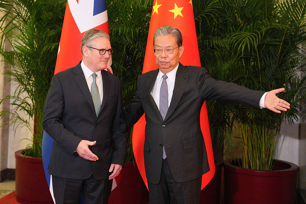 Left turn: Zhao Leji (R), Chairman of the Standing Committee of China’s National People’s Congress, gives directions to Britain’s Prime Minister Keir Starmer at the Great Hall of the People in Beijing on January 29, 2026. (Carl Court / POOL / AFP via Getty Images)