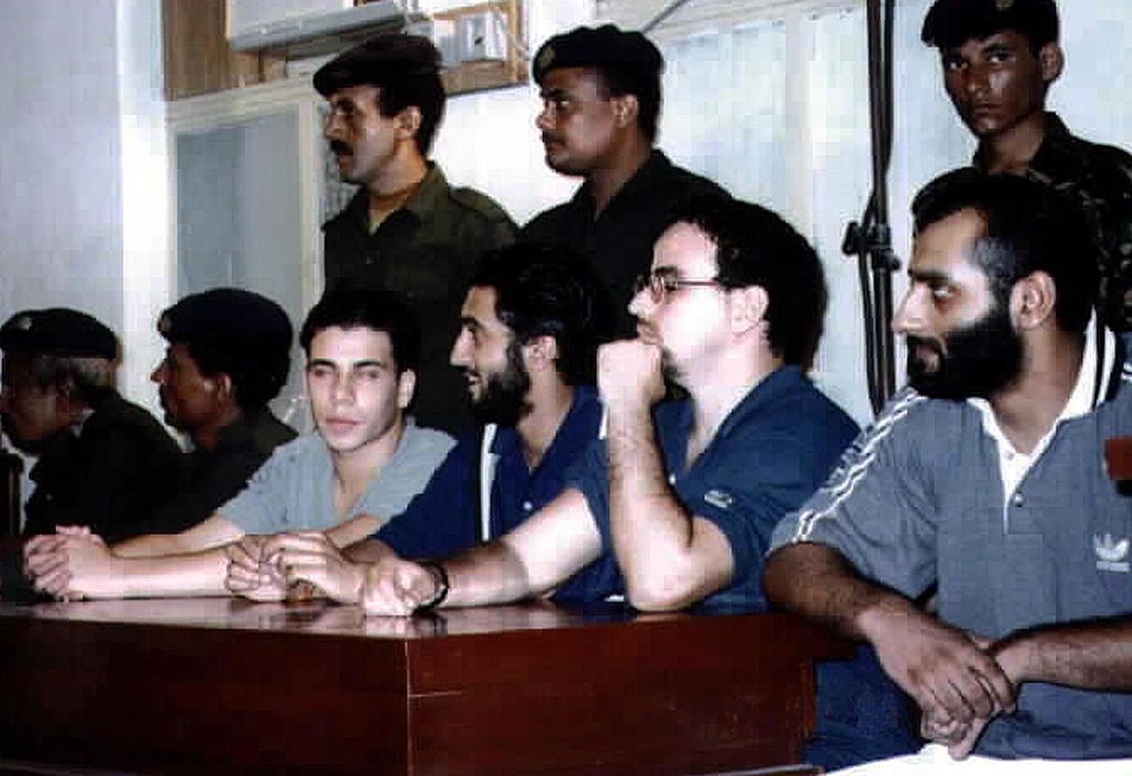 British Moslem (from L to R) Mohamed Mustafa Kamal, the son of British based Moslem fundamentalist Abu Hamza al-Masri, compatriot Shizar Nabi, Algerian Kamal Ali Mohammad and Briton Shahid Butt listen for the court verdict in Aden 09 August 1999. Eight Britons and two Algerians were condemned as terrorists by a Yemeni court and jailed between seven months and seven years for planning a murderous bombing campaign in Yemen. (Photo by AFP) (Photo by -/AFP via Getty Images)