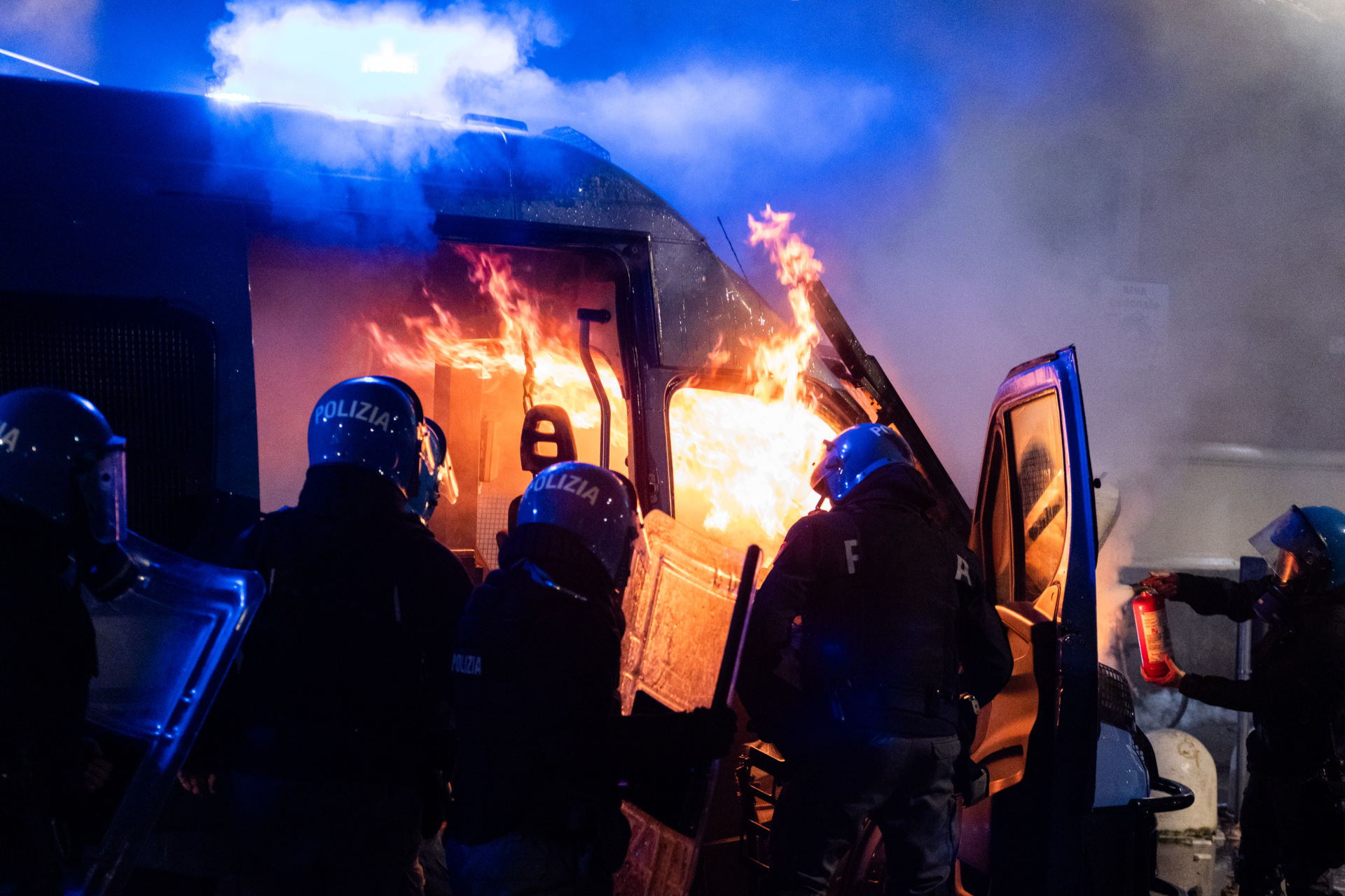 TURIN, ITALY – JANUARY 31: A police van catches fire during clashes between police and protesters, including numerous anarchists and far-left activists from across Italy and abroad, during the nationwide protest against the Italian government, the war, and attacks on social spaces in Turin, January 31, 2026.(Photo by Andrea Carrubba/Anadolu via Getty Images)