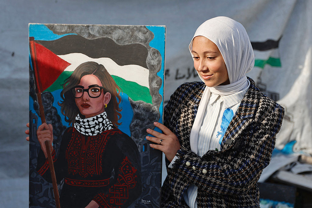 Fifteen-year-old Palestinian Sarah Saada holds a portrait she painted of UN Special Rapporteur Francesca Albanese, in Gaza City on December 30, 2025. (Omar AL-QATTAA / AFP via Getty)