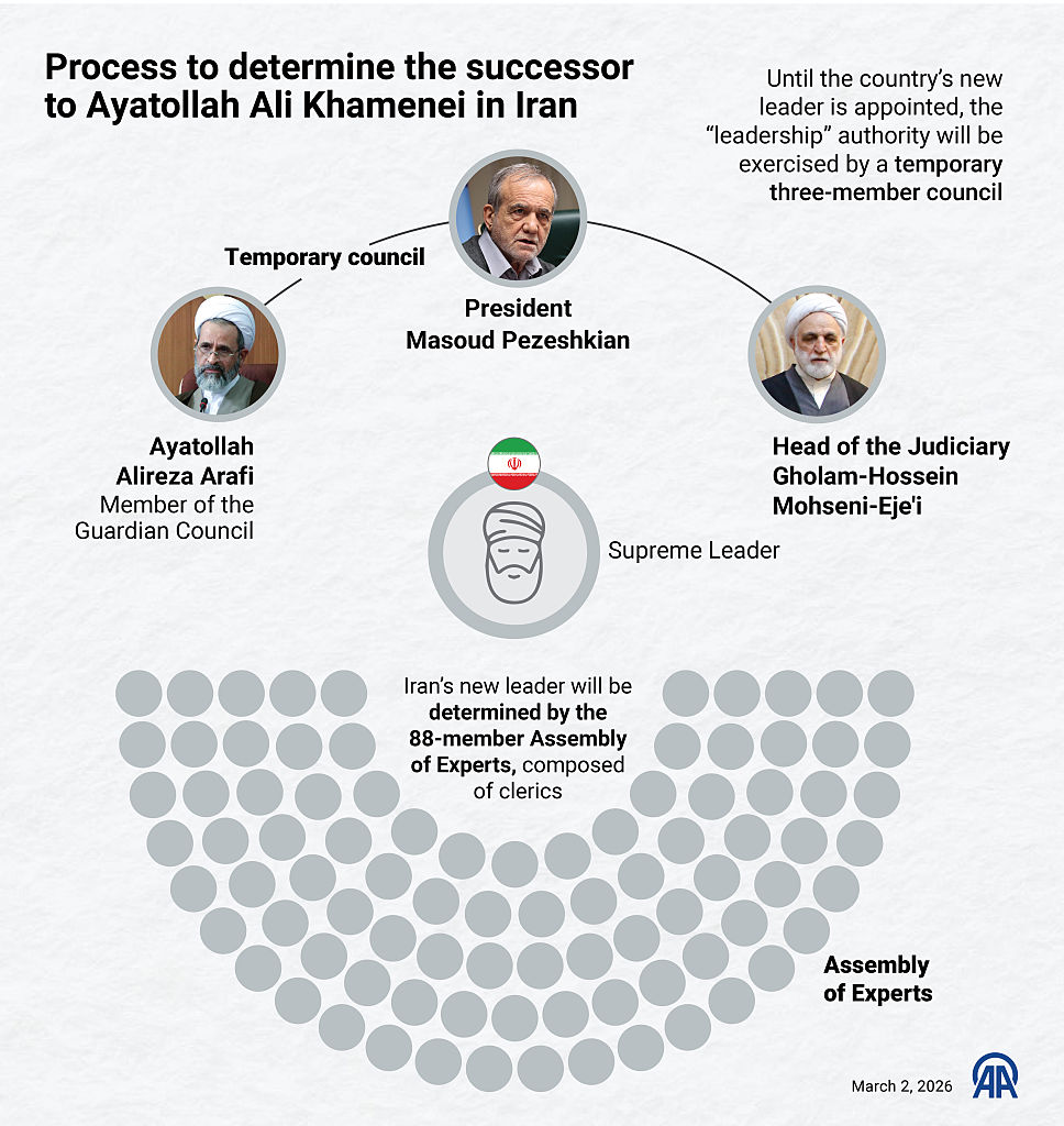 An infographic titled “Process to determine the successor to Ayatollah Ali Khamenei in Iran” created in Istanbul, Turkiye on March 2, 2026. (Photo by Efnan Ipsir/Anadolu via Getty Images)