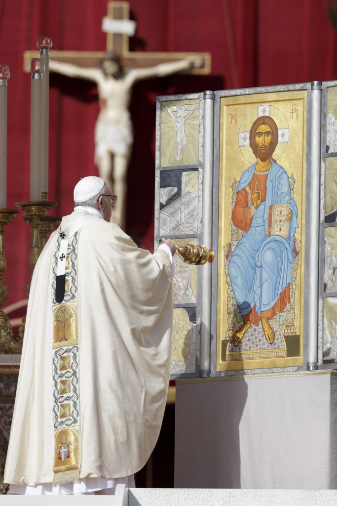 Pope Francis incenses an image of Jesus Christ as he celebrates an Easter mass, in St. Peter’s Square at the Vatican, Sunday, April 1, 2018. (AP Photo/Andrew Medichini)