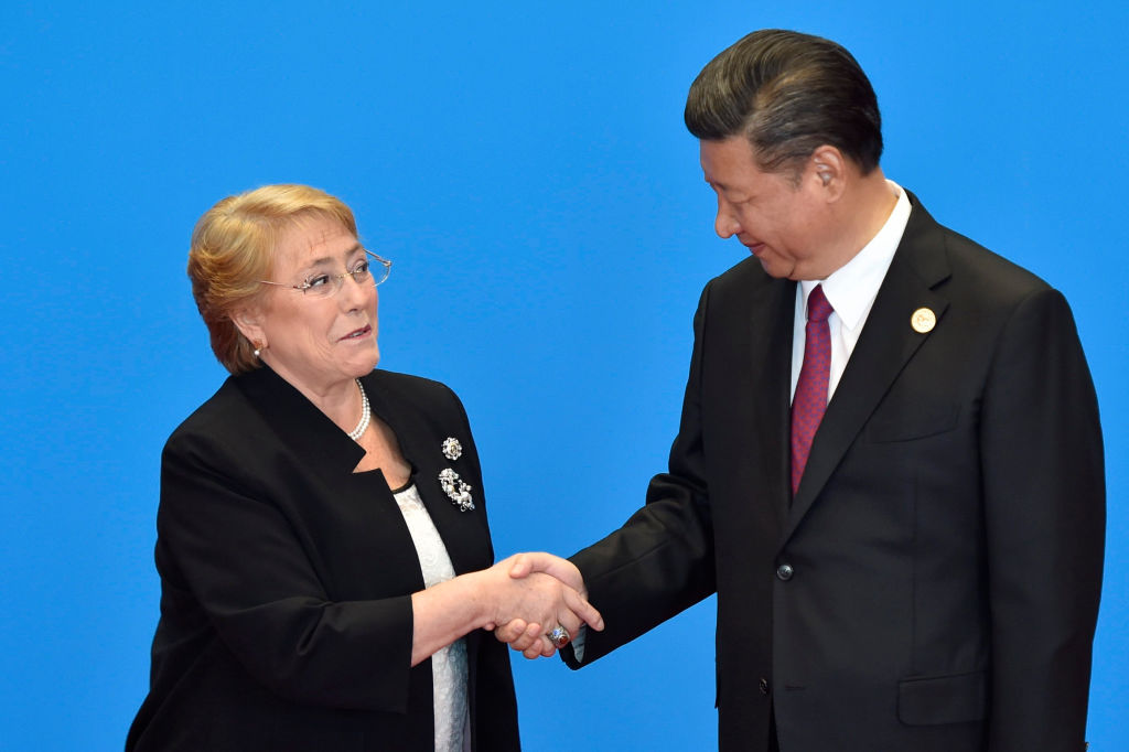 File/Chile’s President Michelle Bachelet (L) shakes hands with Chinese President Xi Jinping during the welcome ceremony for the Belt and Road Forum, at the International Conference Center on May 15, 2017 in Yanqi Lake, north of Beijing, China. (Kenzaburo Fukuhara-Pool/Getty Images)