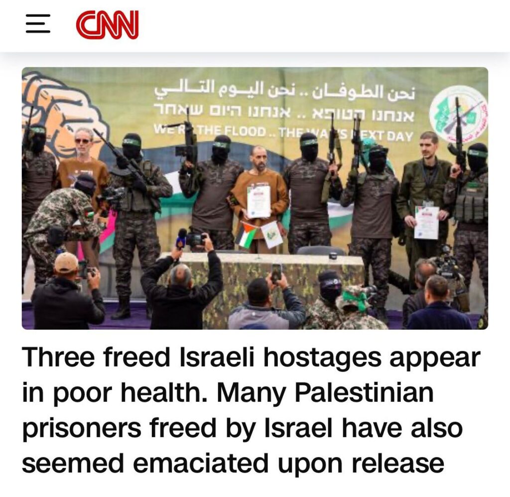 Israel slammed CNN for attempting to compare the Israeli civilians to Palestinian terrorists in a headline that read: “Three Israeli hostages appear in poor health. Many Palestinian prisoners freed by Israel have also seemed emaciated upon release.”
