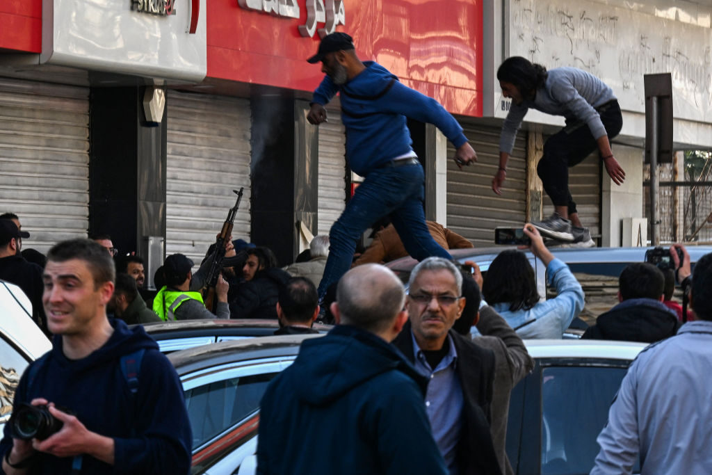 A gunman fires shots in the air to disperse clashing protesters from a rally called for by Syrian activists and civil society representatives “to mourn for the civilian and security personnel casualties”, and others from a counter-demonstration at al-Marjeh square in Damascus on March 9, 2025. (AFP via Getty Images)