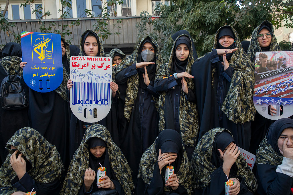 Women participating in the rally, on November 4, 2025, in Tehran, Iran. The march marks the anniversary of the seizure of the US Embassy in Tehran in 1979. Forty-six years ago on this day, supporters of Ayatollah Khomeini stormed the US Embassy in Tehran and occupied the facility for 444 days. (Majid Saeedi/Getty Images)