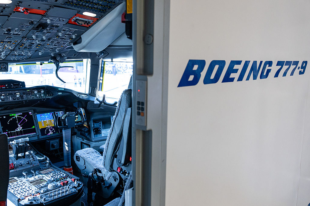 The cockpit of an experimental Boeing 777X aircraft at the Dubai Air Show in Dubai, United Arab Emirates, on Monday, Nov. 17, 2025. The Airshow runs from Nov. 17-21, with expanded space and advanced air mobility pavilions this year.(Christopher Pike/Bloomberg via Getty)