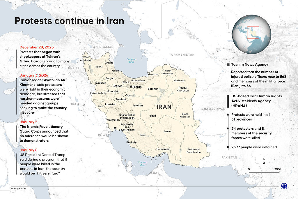 An infographic titled “Protests continue in Iran” created in Istanbul, Turkiye on January 9, 2026. (Efnan Ipsir/Anadolu via Getty Images)