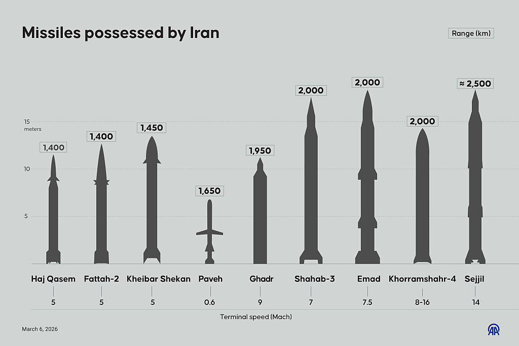 An infographic titled “Missiles possessed by Iran” created in Ankara, Turkiye on March 6, 2026. (Murat Usubali/Anadolu via Getty Images)