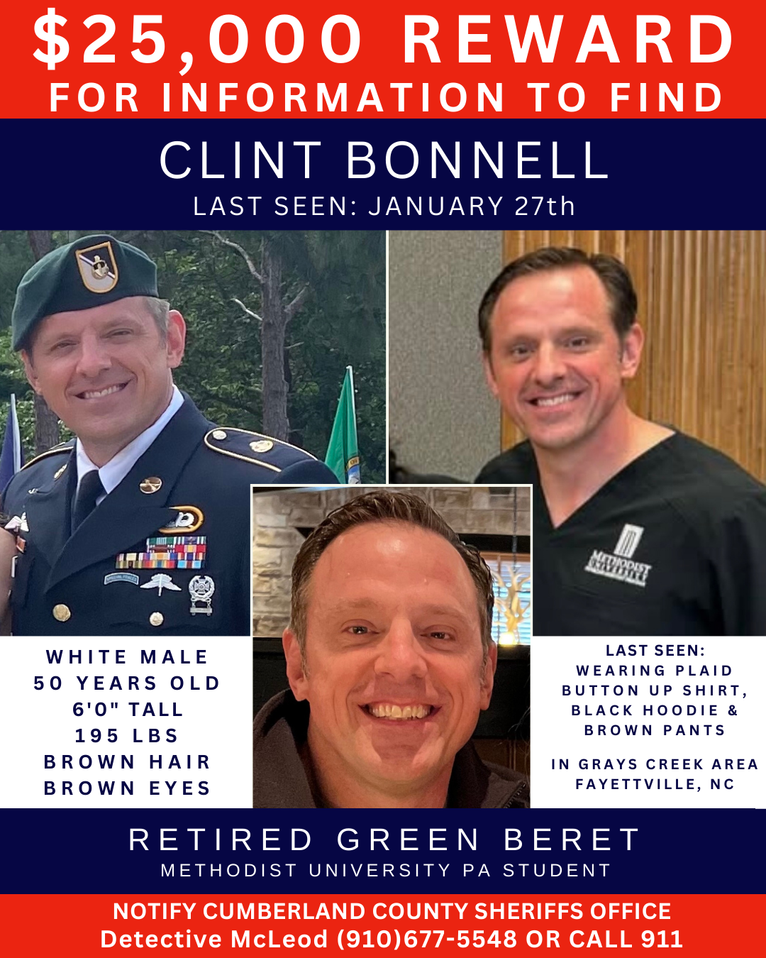 The family of Clint Bonnell, a recently retired Green Beret studying at Methodist University who disappeared in early January, is asking the public for help finding any clues that could lead to his whereabouts.