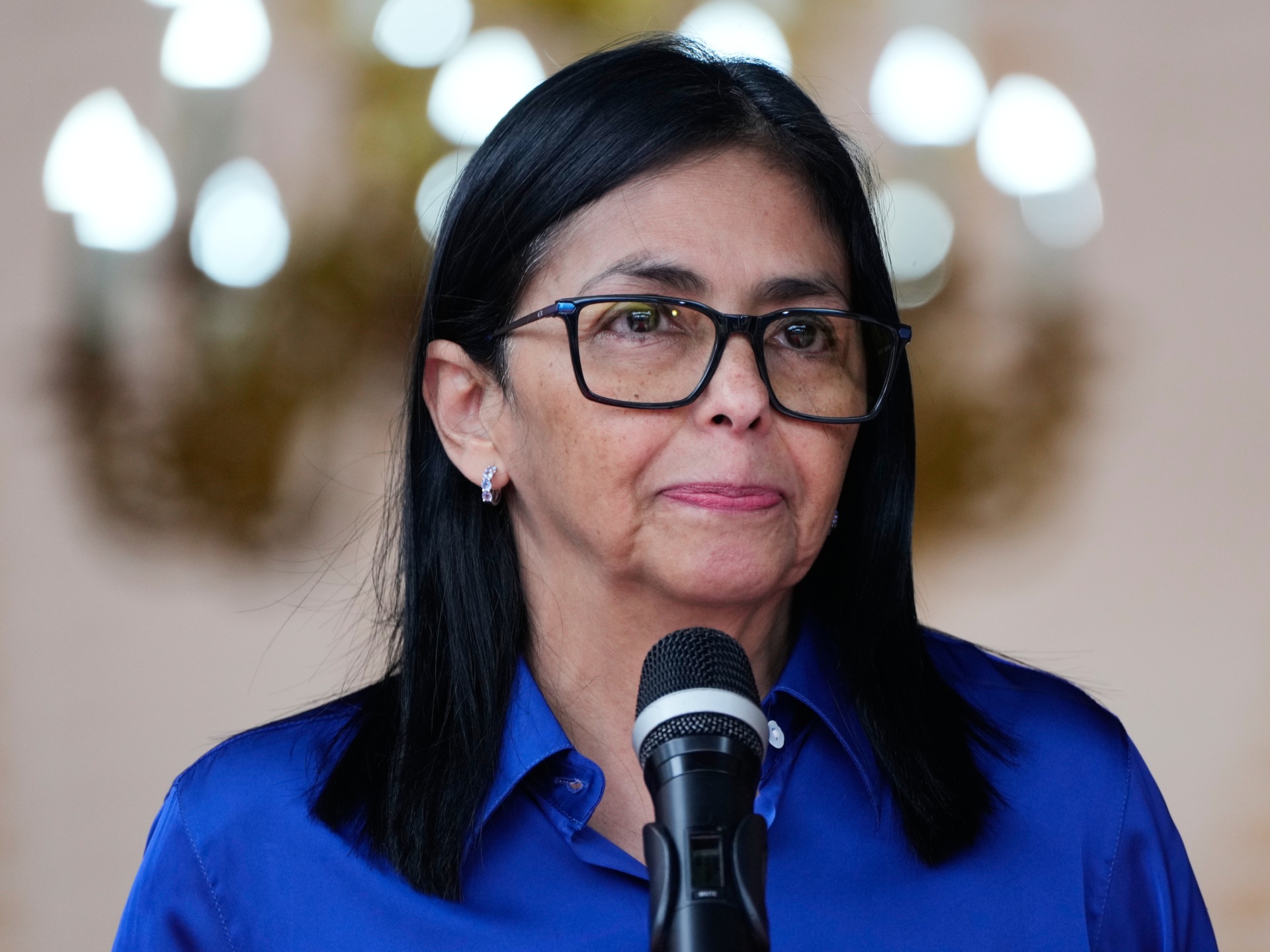 Venezuela’s acting President Delcy Rodriguez makes a statement to the press at Miraflores presidential palace in Caracas, Venezuela, Wednesday, January 14, 2026. (AP Photo/Ariana Cubillos)