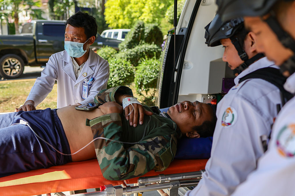 File/An injured Cambodian soldier is taken to a hospital at an undisclosed location, as Cambodia accuses Thailand of launching multiple strikes on Cambodian border areas, in Banteay Meanchey province, Cambodia, on December 26, 2025. (Daniel Ceng/Anadolu via Getty Images)