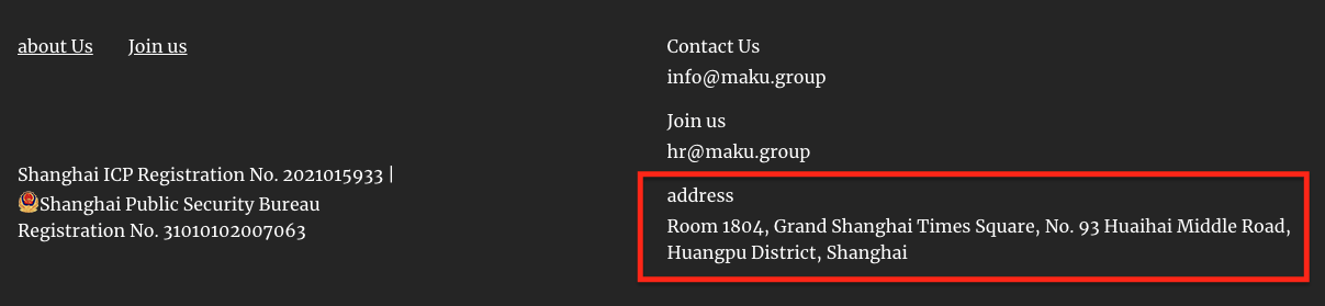 An archived 2023 screen image of Maku’s website which shows the company’s address (highlighted in the image) as being located on the 18th floor of the Grand Shanghai Times Square Office Building. Note: The website was translated into English using Google Translate for this screen image.